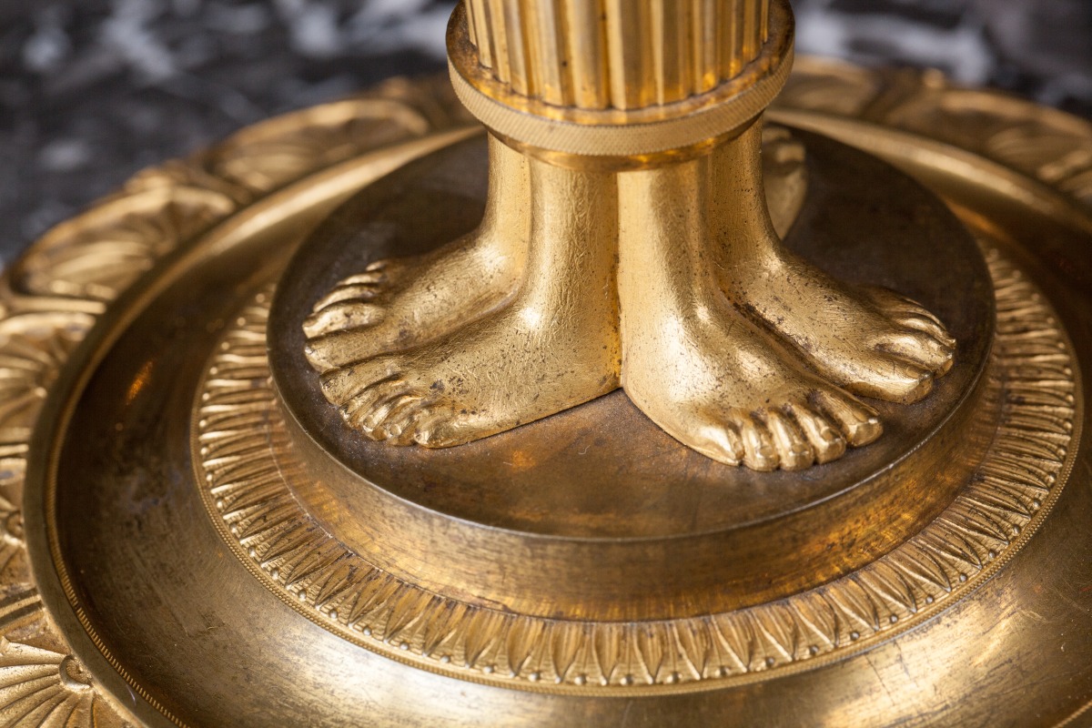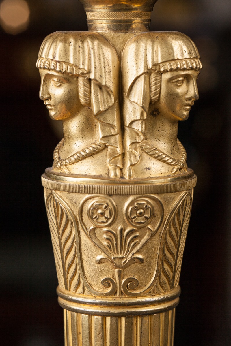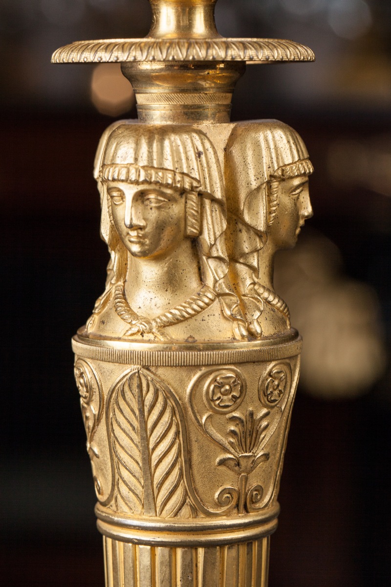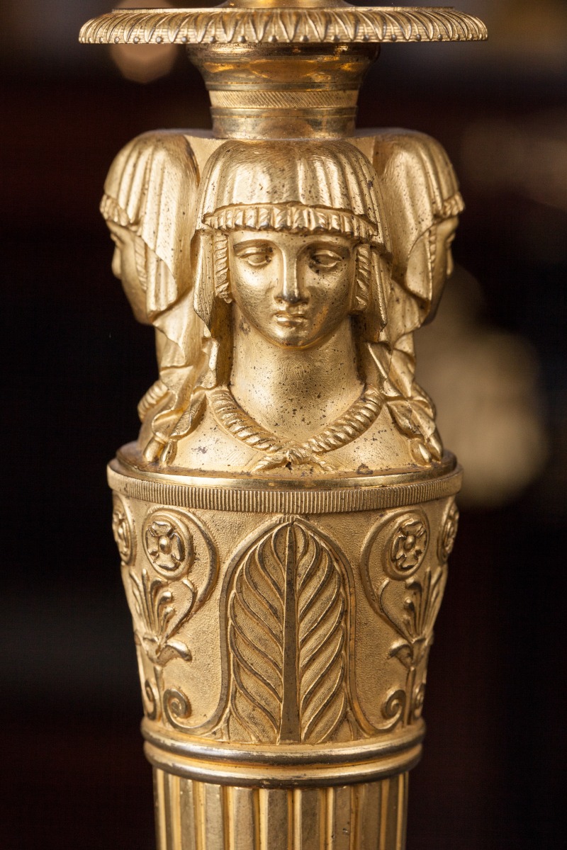 PAIRE de FLAMBEAUX en bronze doré montés en candélabres à trois lumières (anciennement rapportées). Fûts cannelés à trois cariatides. Bases rondes à palmettes et feuilles d'eau.