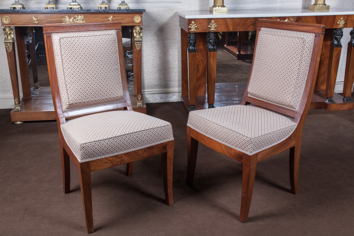 PAIRE de CHAISES en acajou et placage d'acajou à dossier plat. Pieds en sabre.