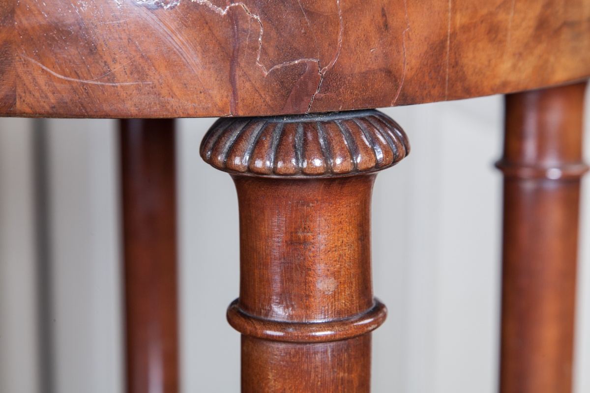 MEUBLE ÉTAGÈRE de milieu de forme ronde en acajou, placage d'acajou et bois fruitier. Six montants colonne à chapiteau godronné à quatre plateaux d'entretoise hexagonaux.