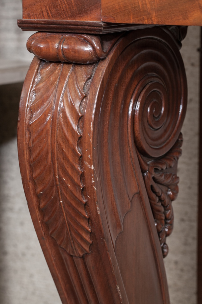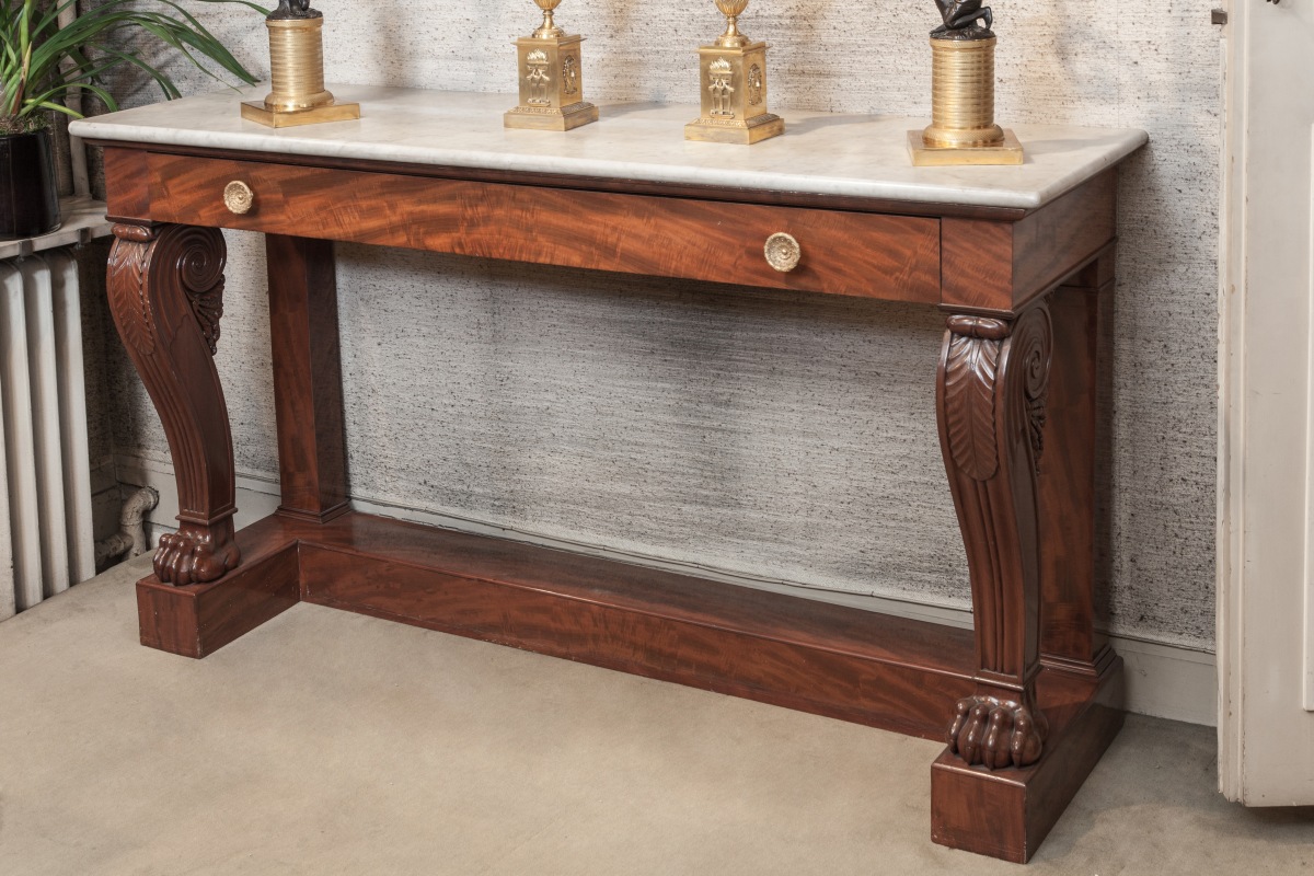 CONSOLE d'APPLIQUE rectangulaire en acajou et placage d'acajou ouvrant à un tiroir. Montants antérieurs en console à volutes, à griffes de lion sculptées de feuilles d'acanthe et laurier. Montants arrières en pilastre. Base socle échancrée. Poignées en bronze doré. Dessus de marbre blanc veiné.