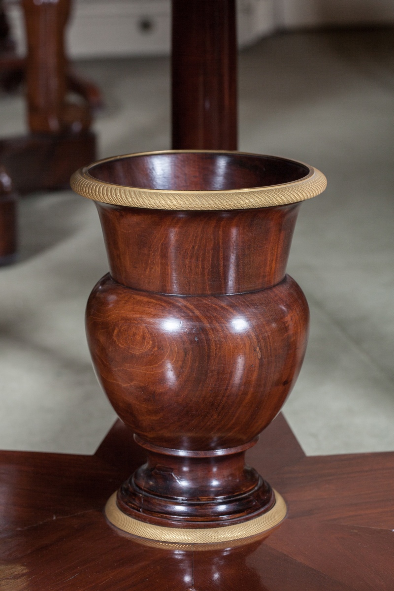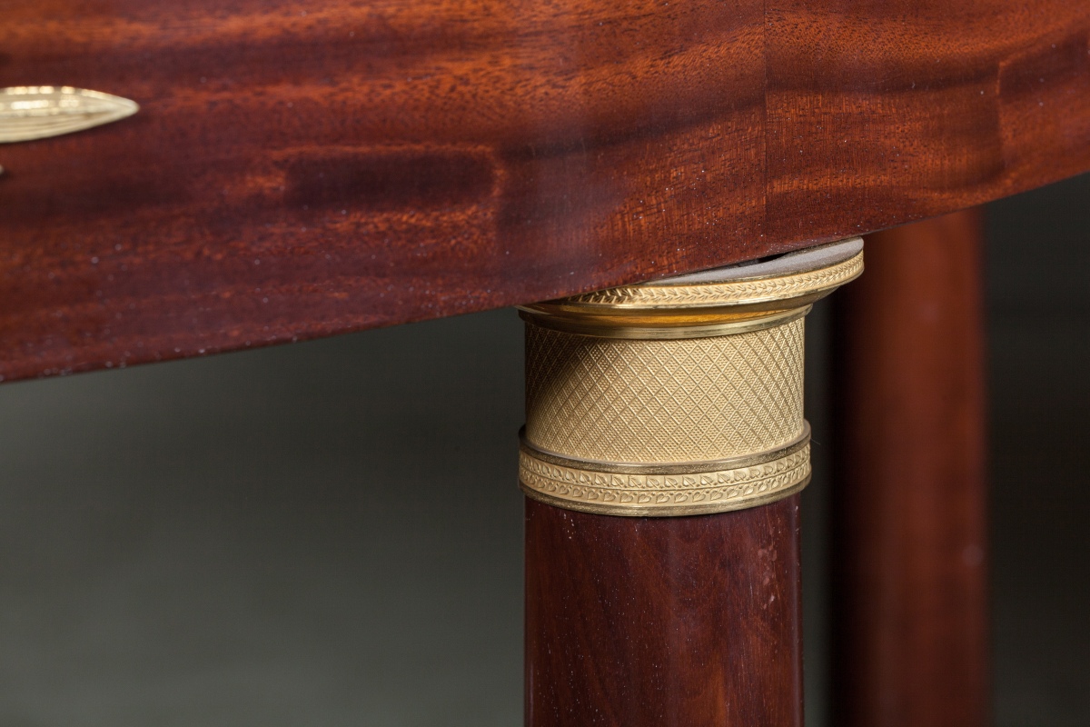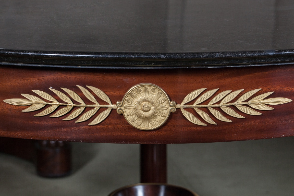 Large GUÉRIDON en placage d'acajou à cinq montants en colonne à bases et chapiteaux de bronze doré guilloché. Entretoise socle en étoile ornée d'un vase Médicis. Dessus de marbre noir de Belgique à cuvette.
