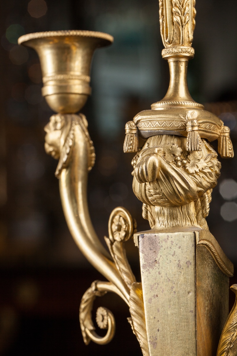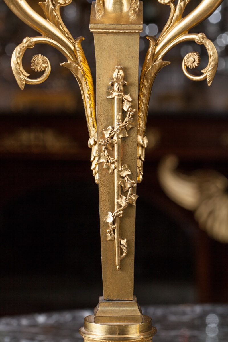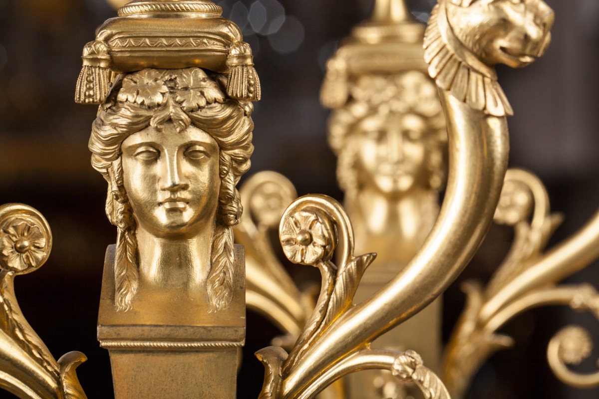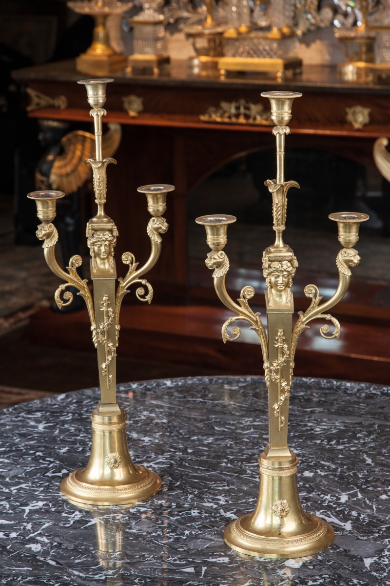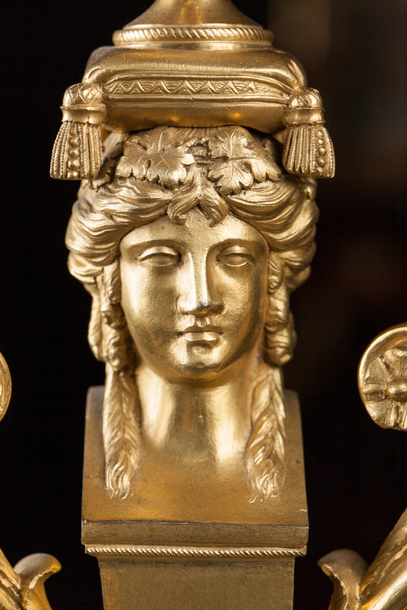PAIRE de CANDÉLABRES en bronze doré à trois lumières à décor d'une bacchante en gaine, d'un thyrse, de têtes de félins et volutes feuillagées.