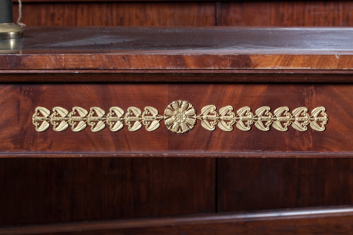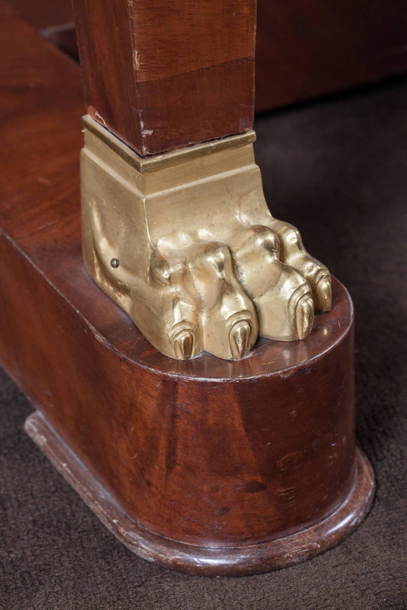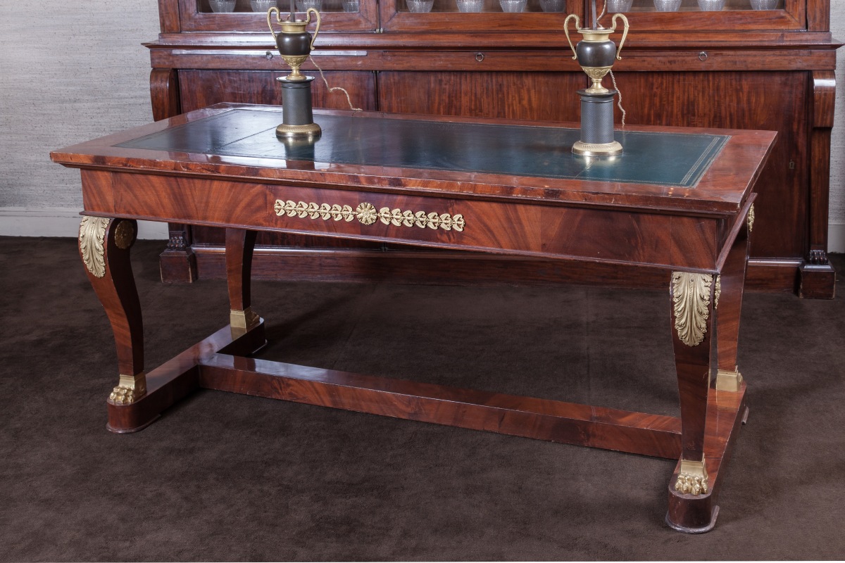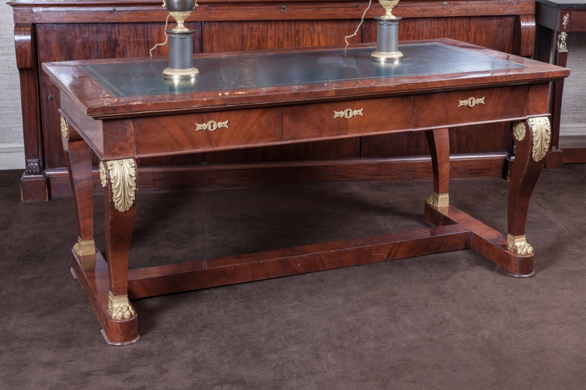 BUREAU PLAT en placage d'acajou toutes faces, ouvrant à trois tiroirs et deux tirettes latérales. Montants en console à griffes de lion, feuilles d'acanthes et fleurons en bronze doré. Entretoise socle en H. Dessus de cuir vert doré.