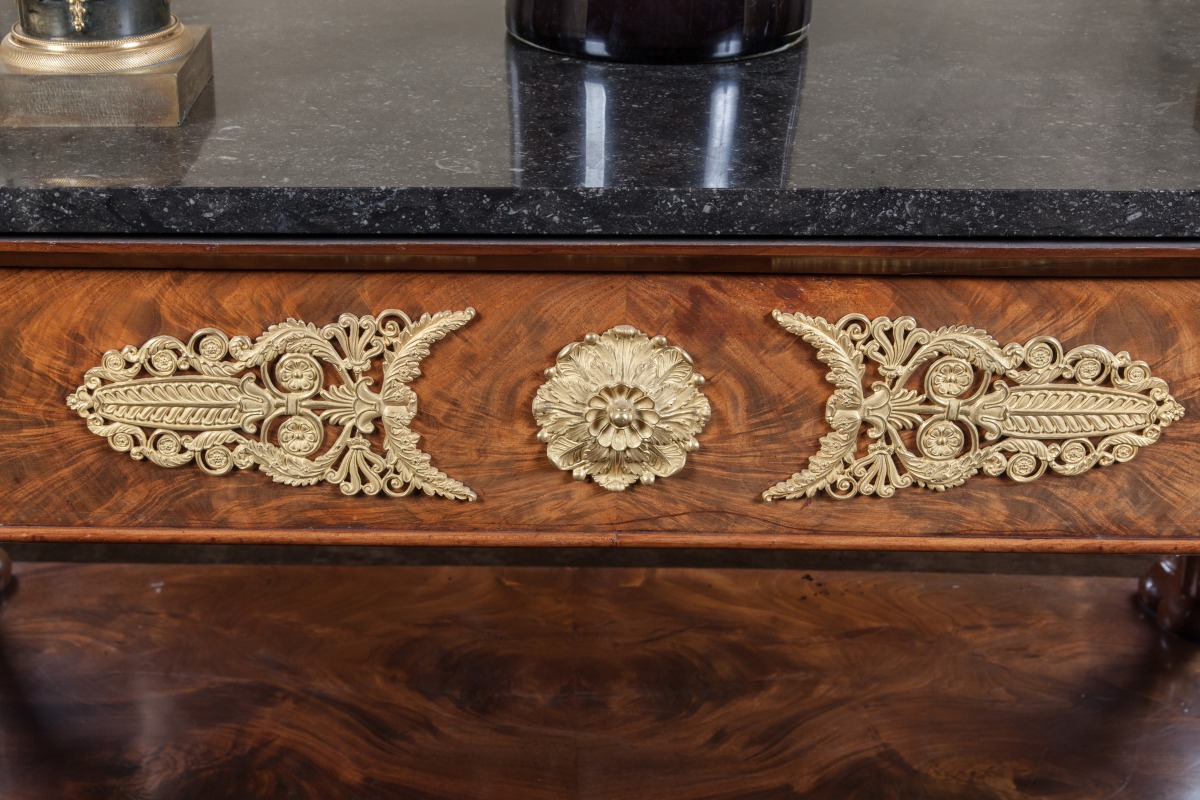 Large CONSOLE DESSERTE rectangulaire en acajou et placage d'acajou flammé ouvrant à un tiroir. Montants antérieurs en jarrets de lion sculptés d'une palmette. Fond de glace entre deux pilastres sur une base socle. Ornementation de bronzes ciselés et dorés : casques romains, feuilles de chêne et de laurier, fleurons, palmettes et rinceaux feuillagés. Dessus de granit noir de Belgique.