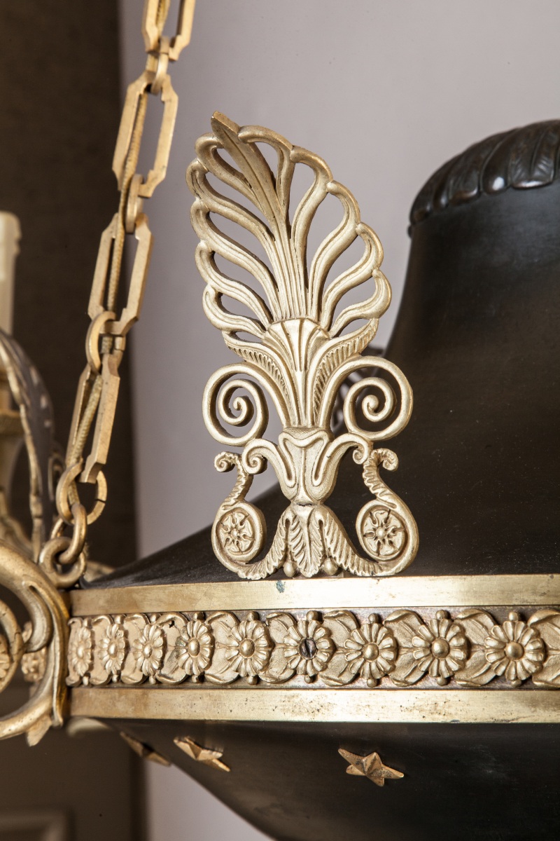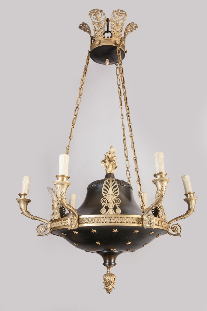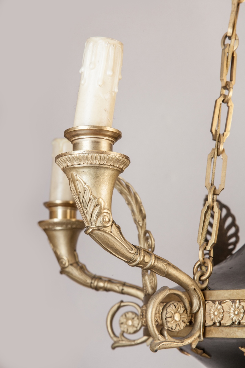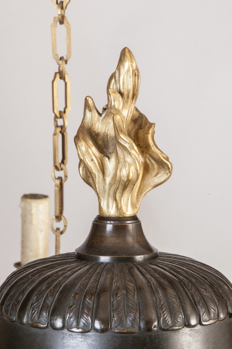 LUSTRE en forme de lampe antique à trois chaînes de suspension en bronze doré, bronze et tôle patinés, à six bras de lumière à volutes. Décor de palmettes, étoiles et feuilles d'acanthe.
