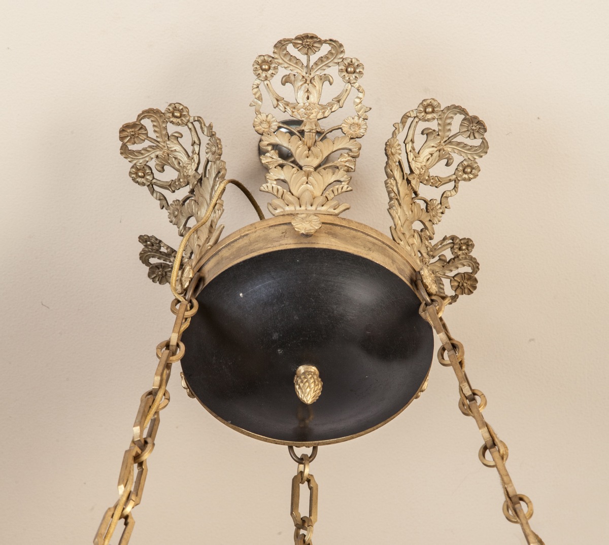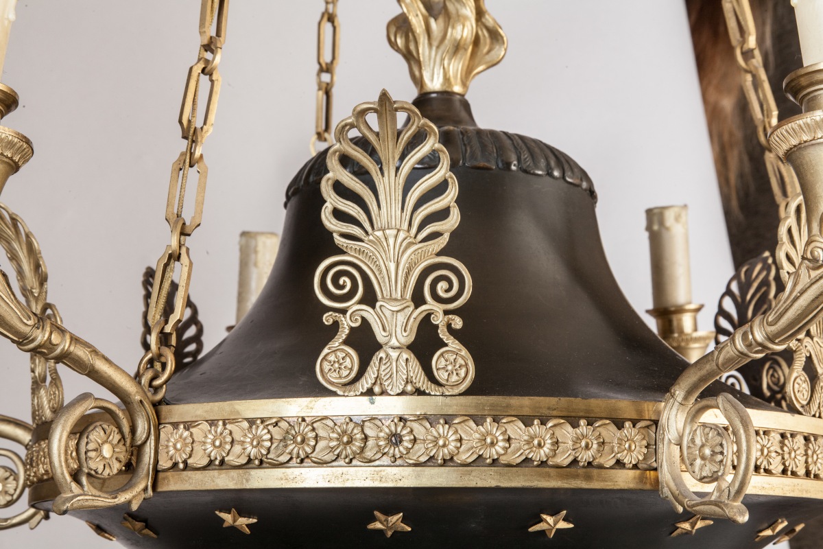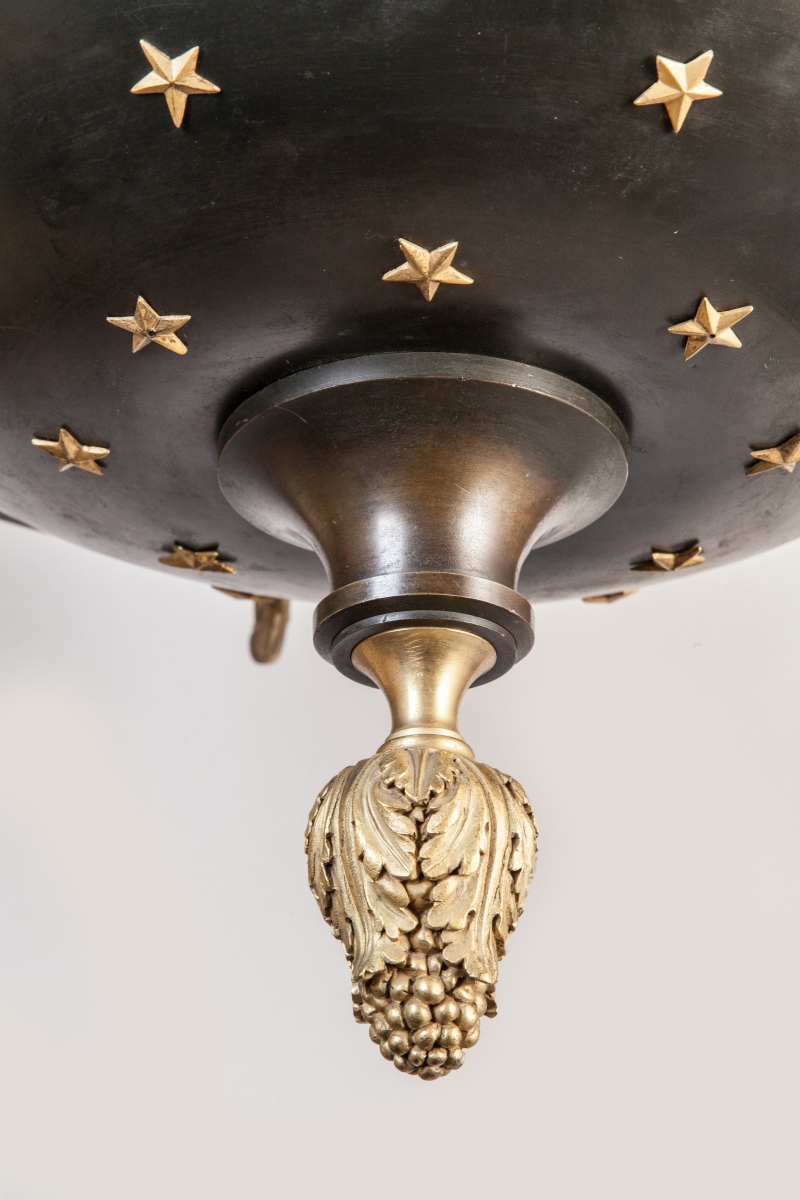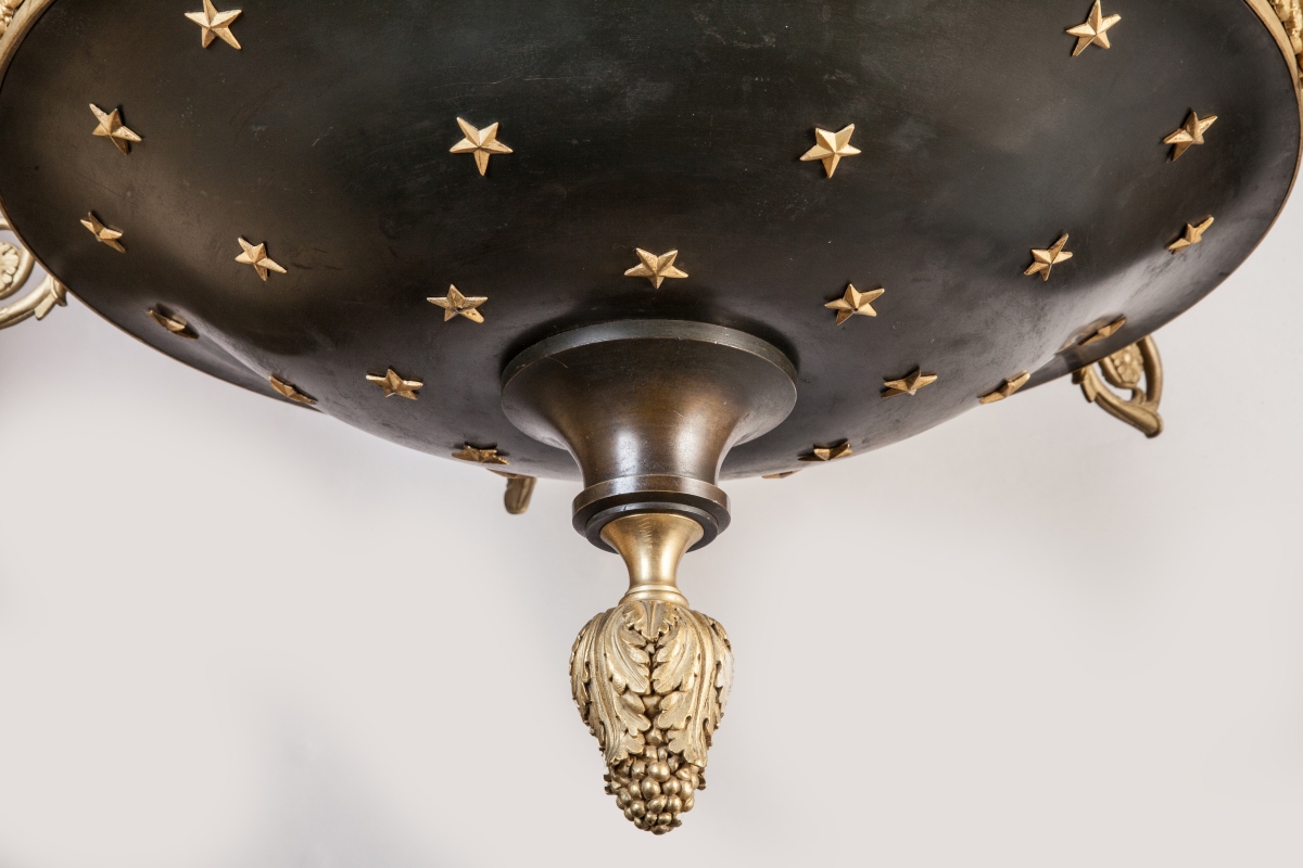LUSTRE en forme de lampe antique à trois chaînes de suspension en bronze doré, bronze et tôle patinés, à six bras de lumière à volutes. Décor de palmettes, étoiles et feuilles d'acanthe.