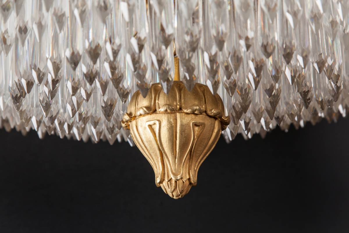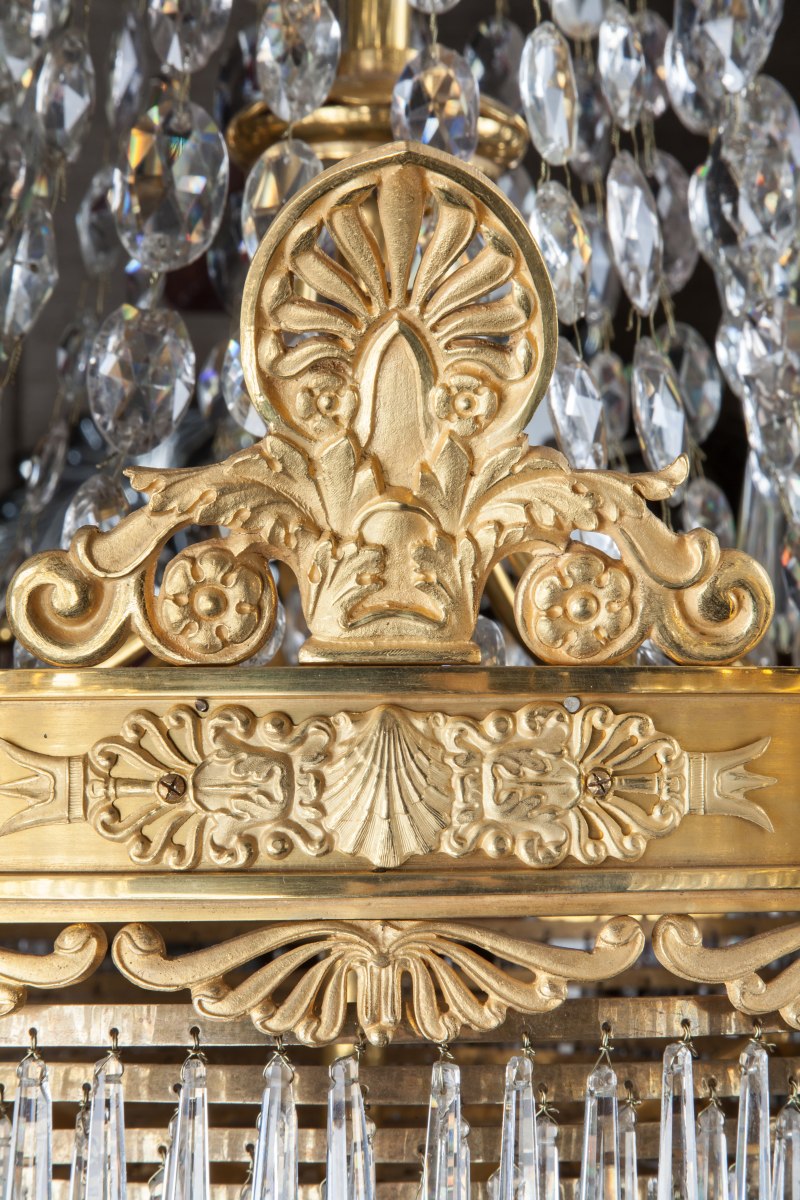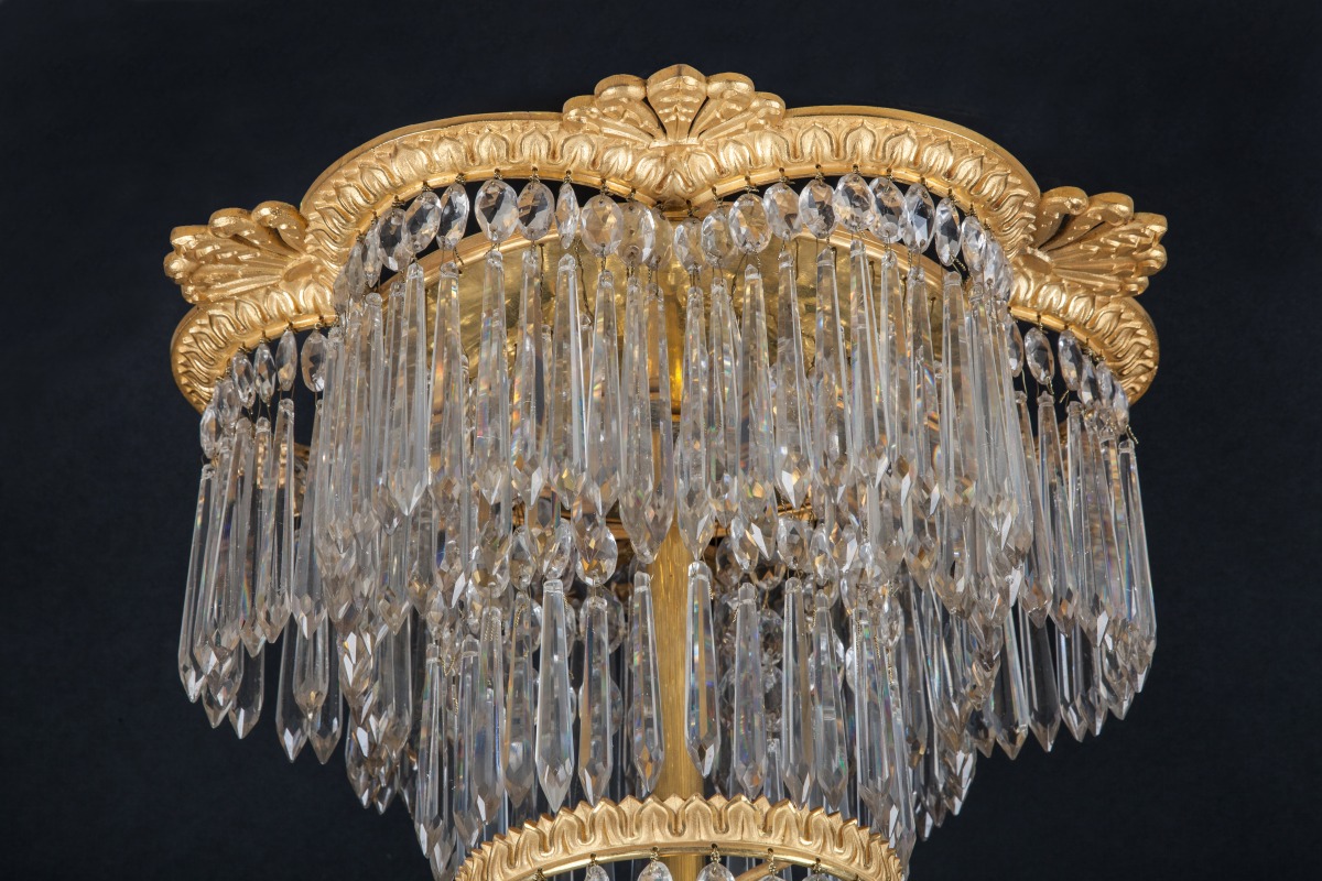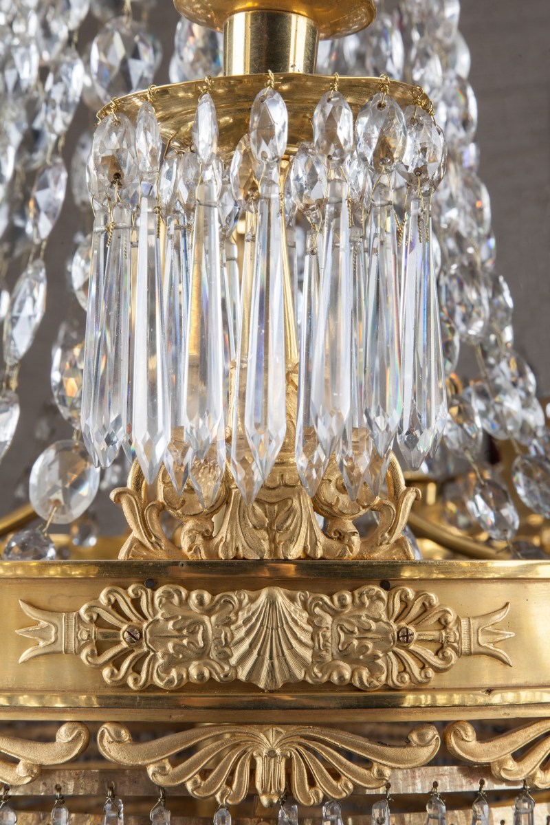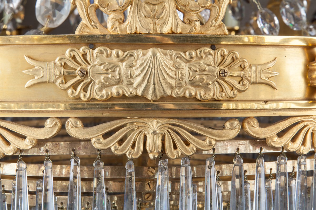 LUSTRE couronne à douze lumières sur deux rangs à décor de palmettes, coquilles et feuilles d'acanthe en bronze doré orné de pampilles et perles taillées de cristal