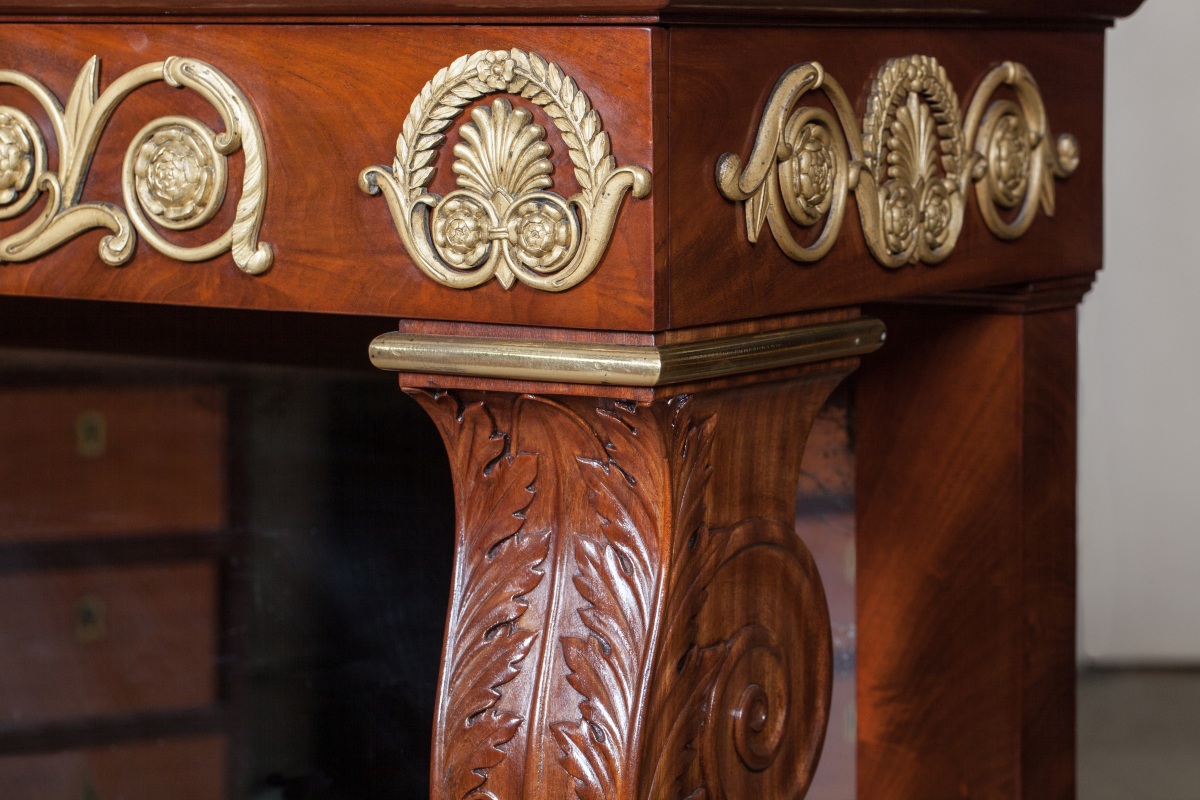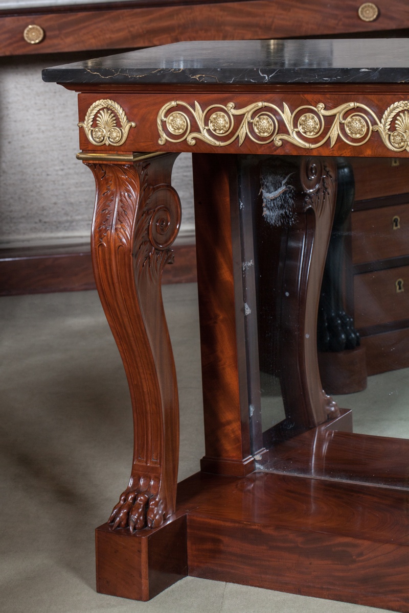 CONSOLE d'APPLIQUE rectangulaire en acajou et placage d'acajou, ouvrant à un tiroir. Montants antérieurs en console à volutes et griffes de lion, ornés de feuilles d'acanthes et cannelures. Montants arrières en pilastre à fond de glace. Base socle échancrée. Ornementation de bronzes dorés : volutes de branches fleuries, palmettes et couronnes de feuillages. Dessus de marbre portor (réparé).
