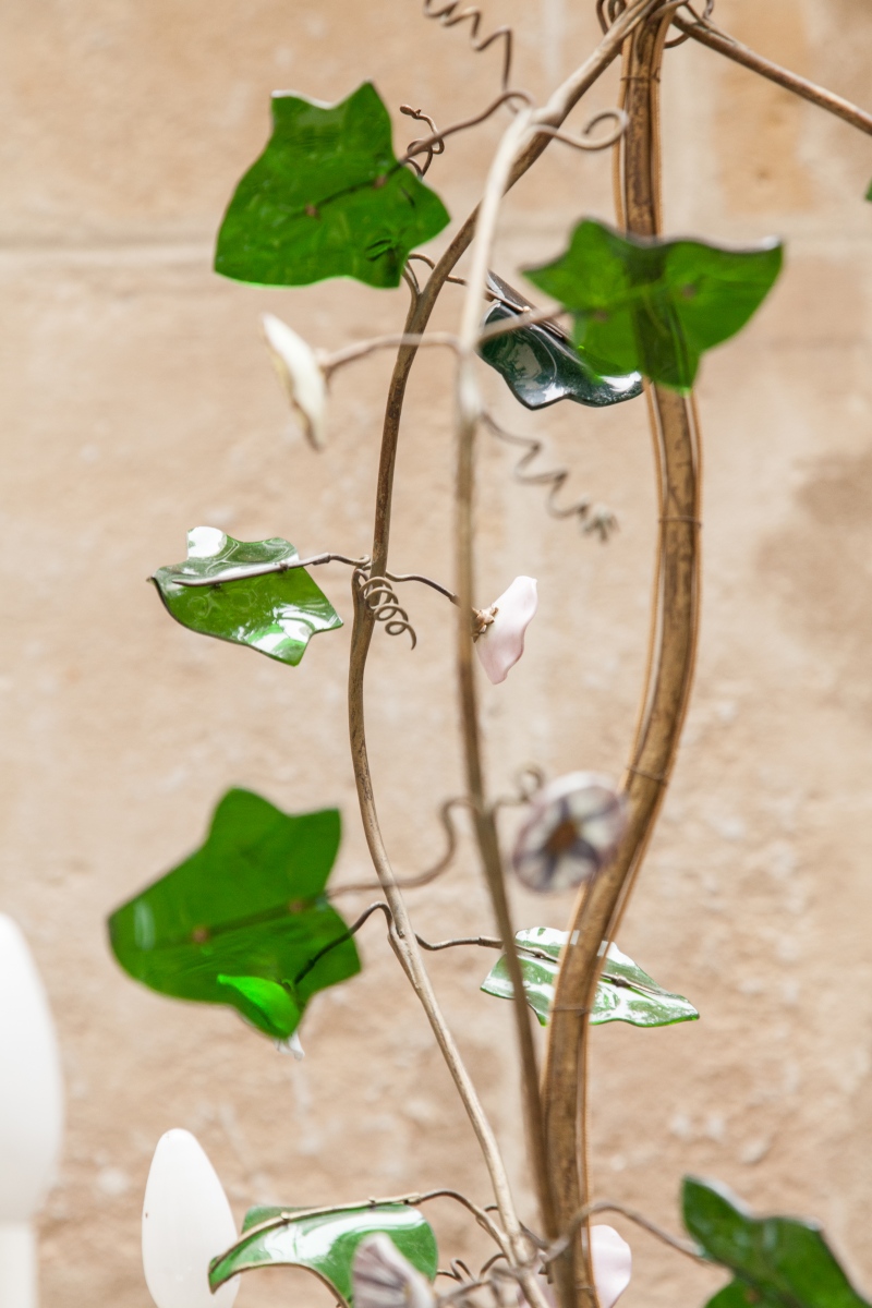 LUSTRE aux liserons en bronze doré orné d'un panier de vannerie orné d'un bouquet à six branches de lumière. Bobèches en corole, fleurs et feuilles en opaline et verre teinté.