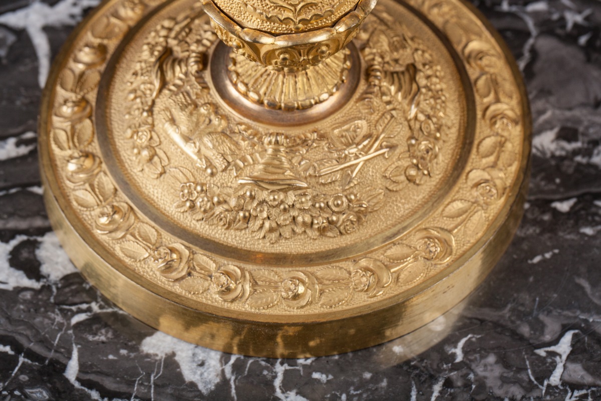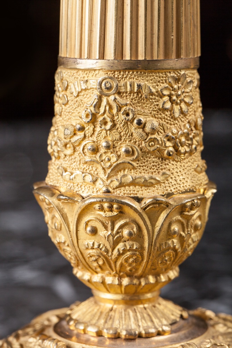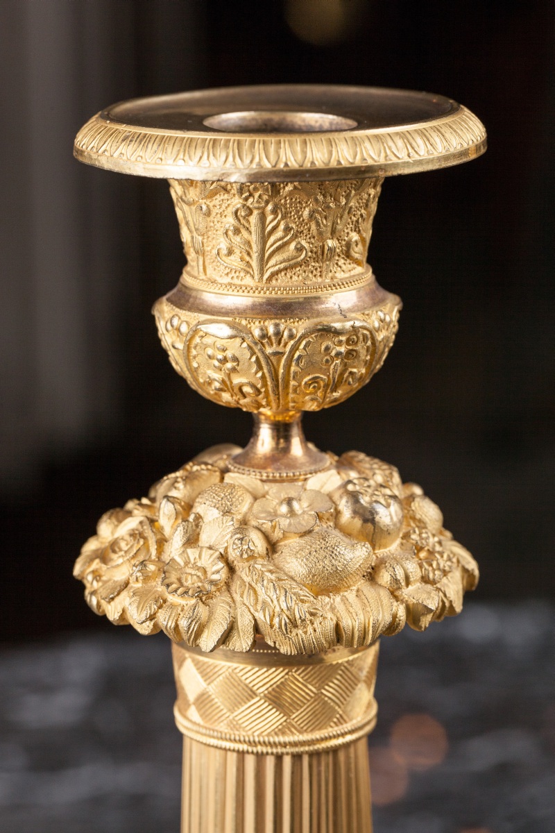 PAIRE de FLAMBEAUX en bronze ciselé doré à fûts en colonnes cannelées. Chapiteaux en forme de corbeilles de fruits et de fleurs. Bases rondes à ombilics à décor de courses de roses, couple de colombes, flèches, papillons et fleurs.