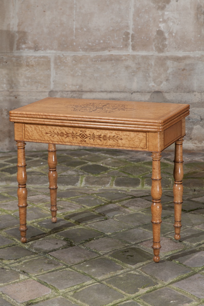 TABLE À JEUX à plateau serviette en placage d'érable moucheté à décor marqueté de filets, palmettes et volutes feuillagées en amarante. Pieds tournés à bagues d'amarante.