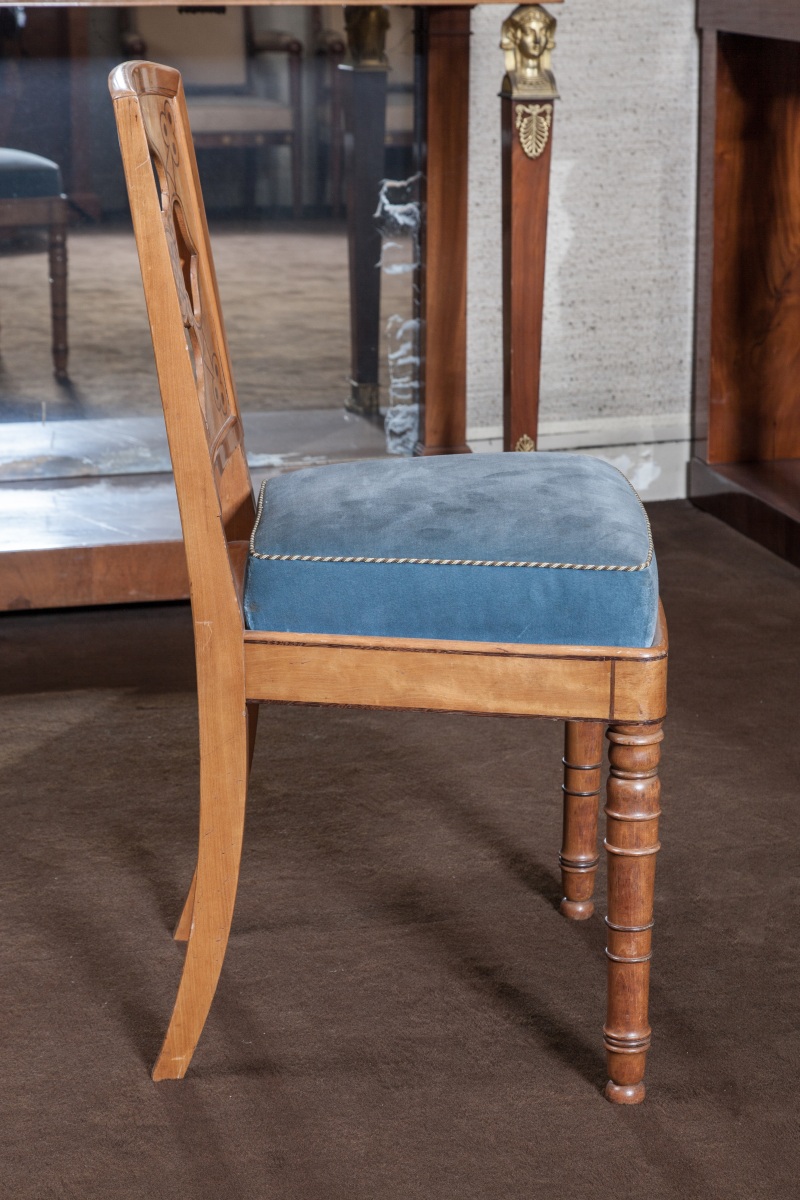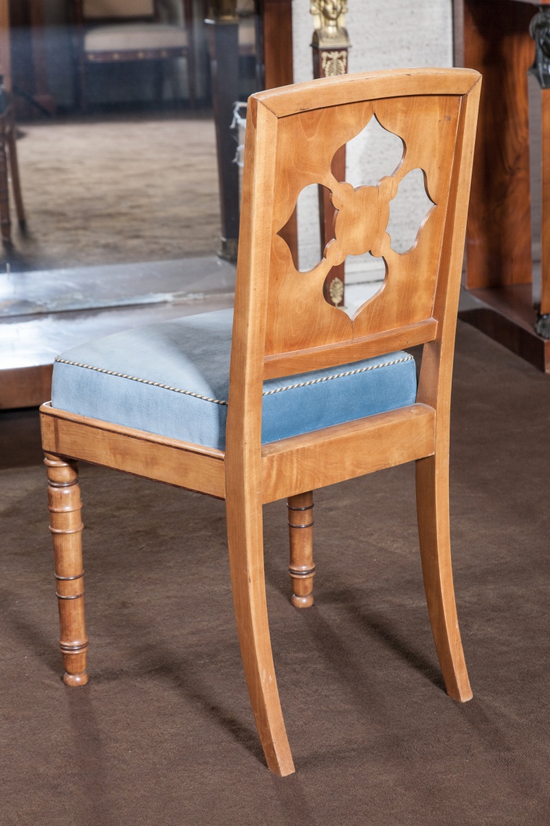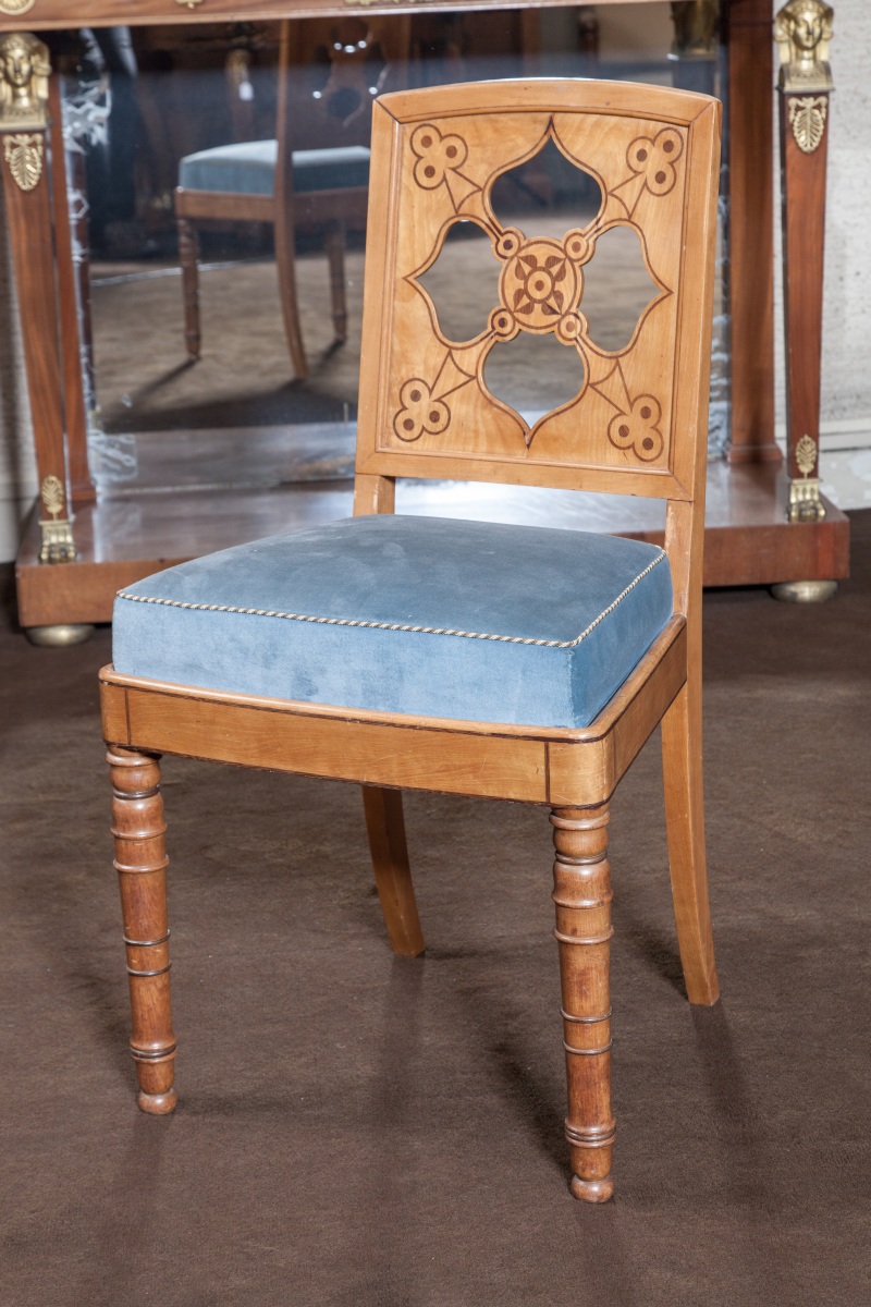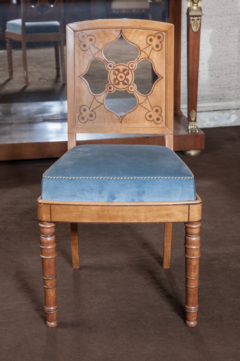 Suite de TROIS CHAISES à châssis en citronnier à décor marqueté, en amarante, de filets et trèfles. Dossiers ajourés en quatre-feuilles. Pieds antérieurs fuselés et annelés, pieds arrières en sabre.