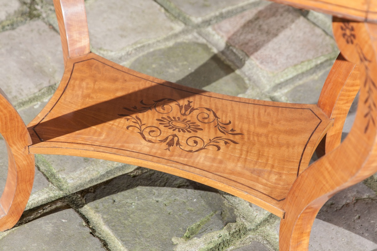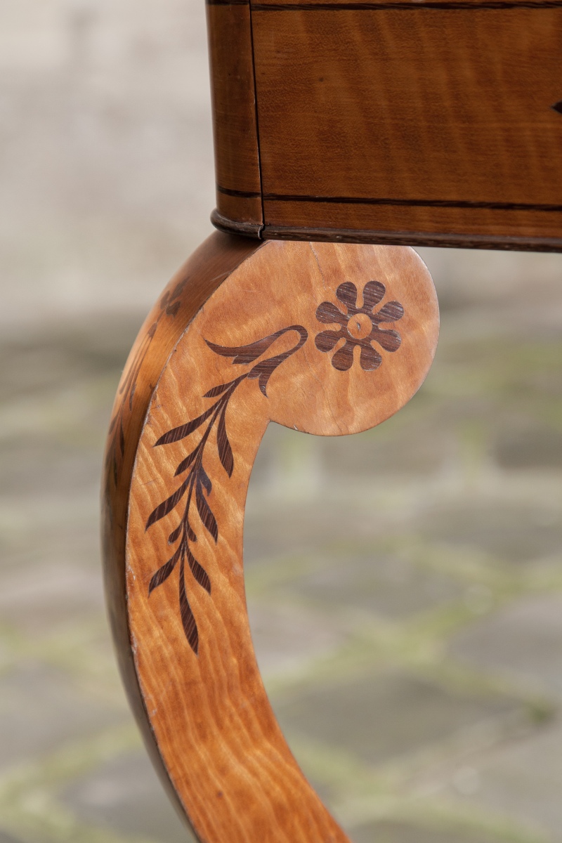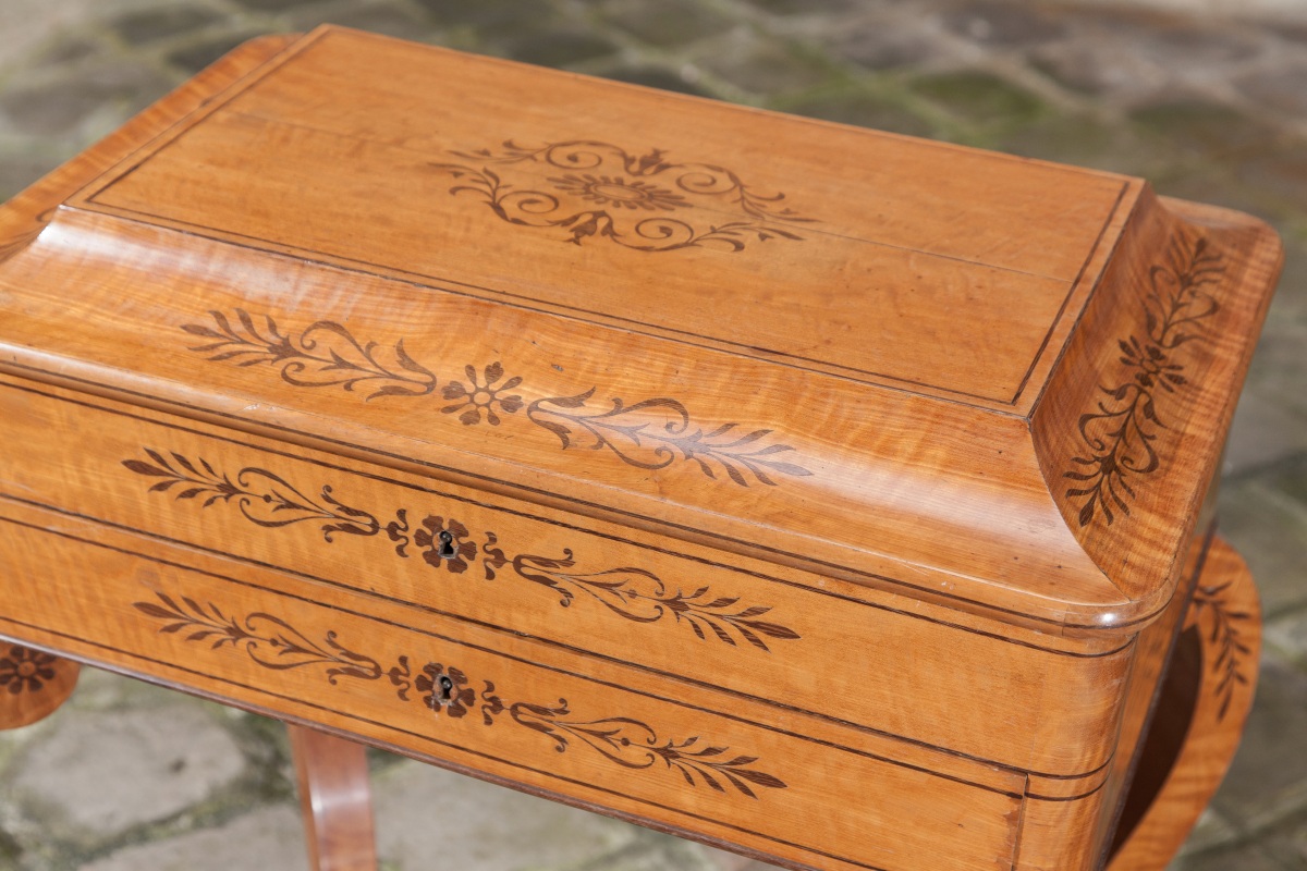 TABLE TRAVAILLEUSE à doucine renversée en placage de citronnier et érable moucheté à décor marqueté en amarante de filets, palmettes et fleurons. Plateau ouvrant garni d'un miroir découvrant des casiers. Un tiroir à façade. Montants sinueux à tablette d'entretoise.
