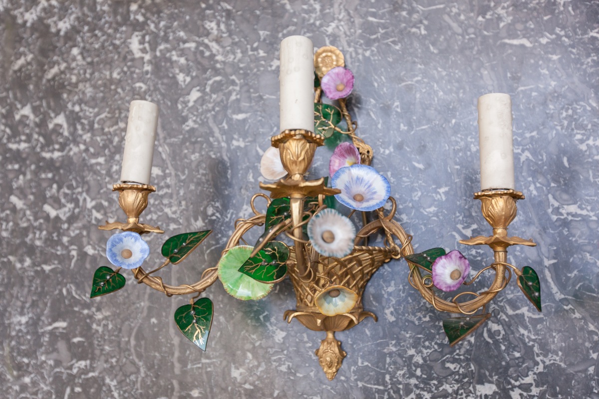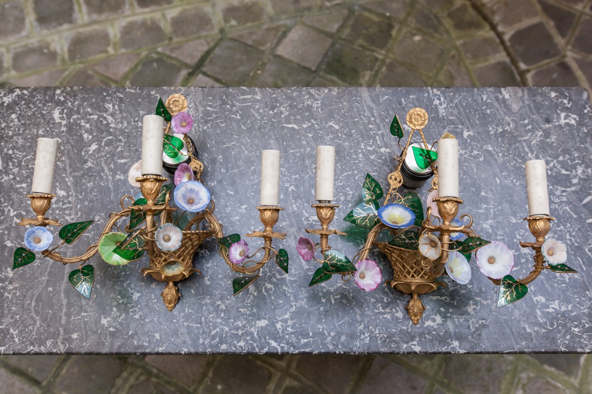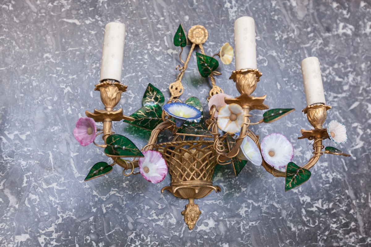 PAIRE d'APPLIQUES à trois lumières en bronze doré à décor de panier de vannerie et branches de liseron à fleurs de porcelaine et feuilles d'opaline verte.