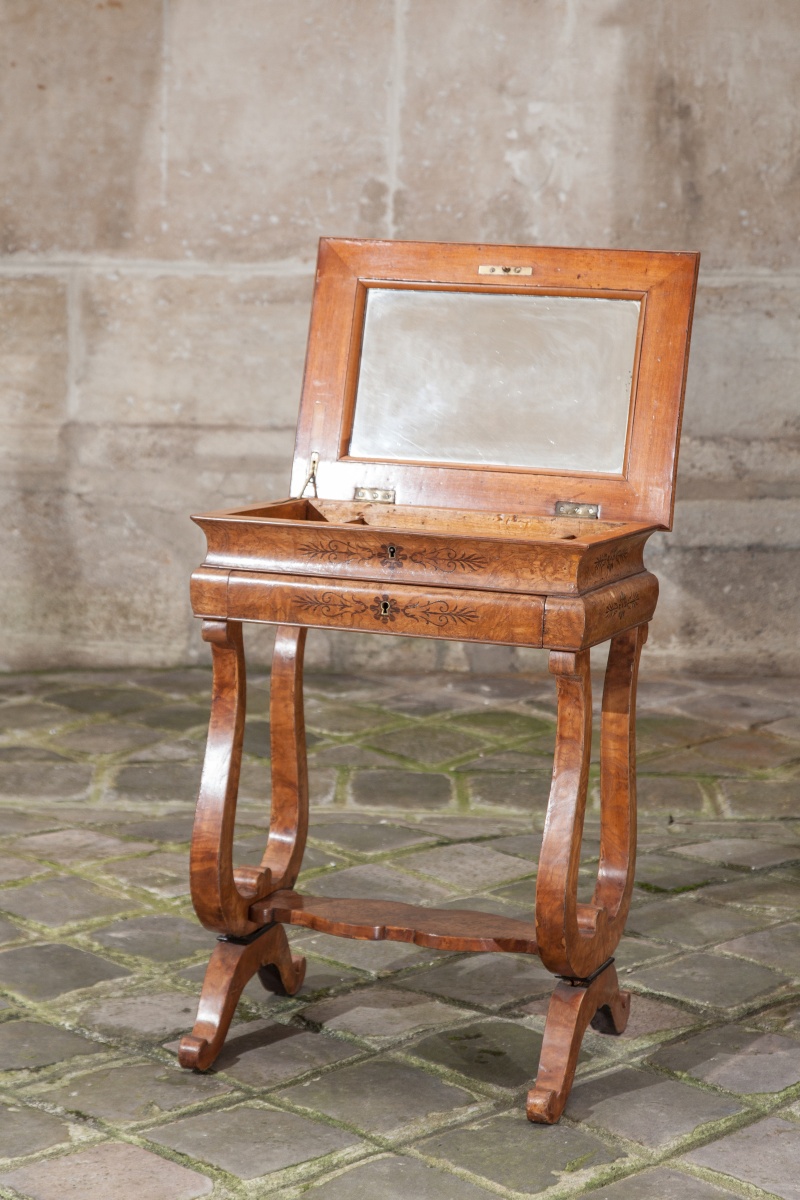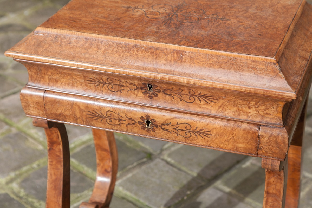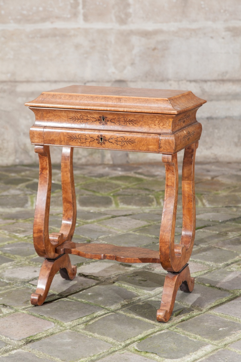 TABLE TRAVAILLEUSE en placage de loupe de frêne à décor incrusté en amarante de fleurons, palmettes et volutes. Plateau à doucine à miroir découvrant des casiers et un tiroir en ceinture. Montants en lyre ajourée sur deux patins et entretoise plate chantournée.