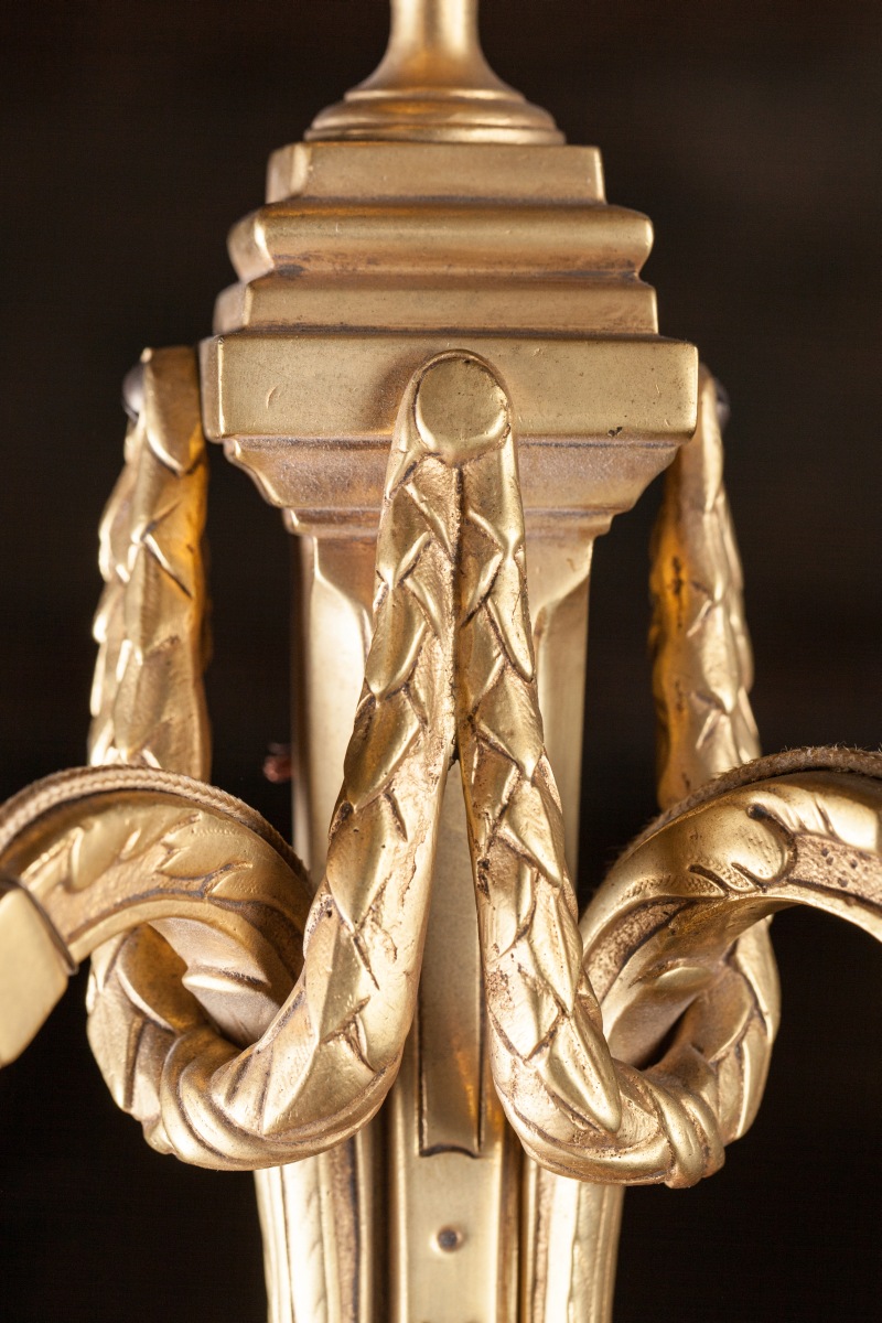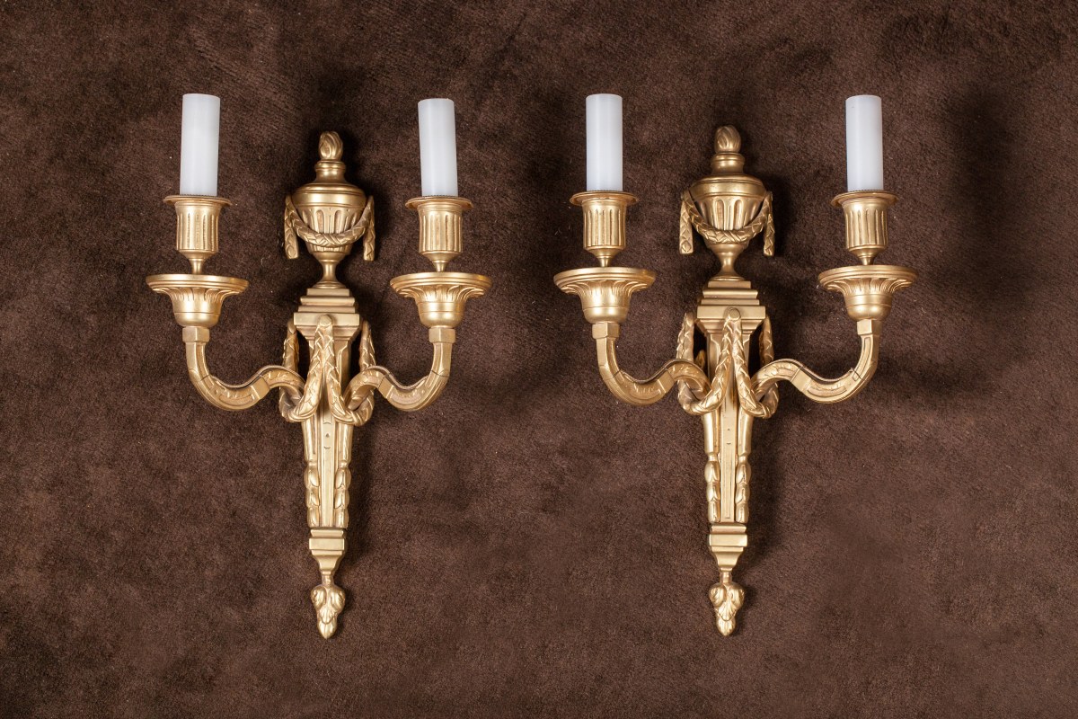 PAIRE d'APPLIQUES en bronze doré à deux bras de lumière et fût en gaine sommé d'une urne.