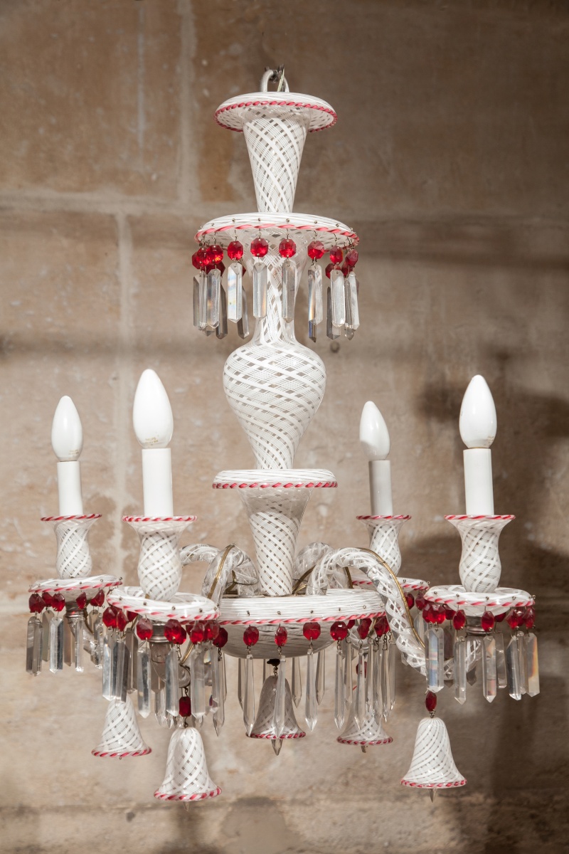 Petit LUSTRE à quatre lumières en verre soufflé à décor de retorti, latticini et filets rouges, le fût à coupes et balustres. Il est orné de clochettes, mirzas et olives rubis.