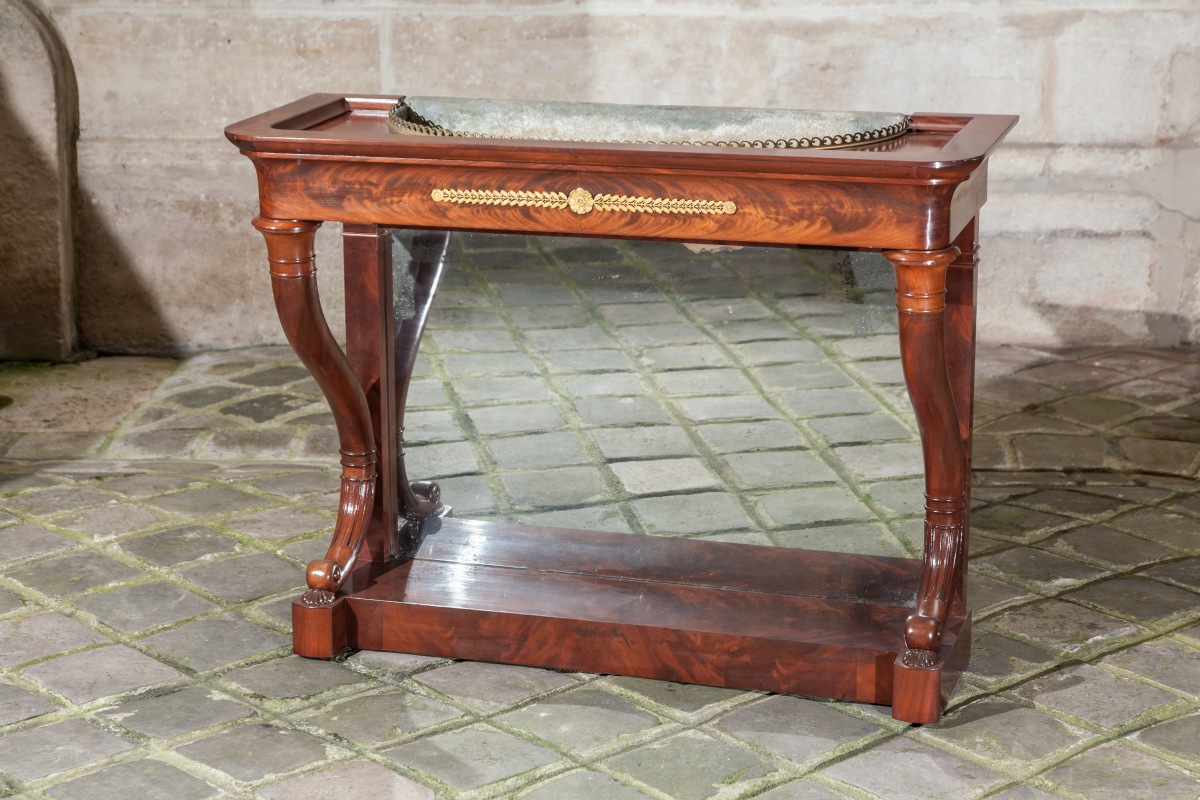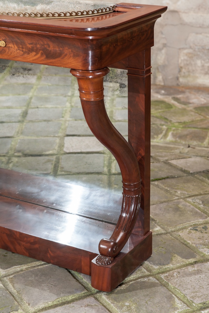 CONSOLE jardinière en acajou et placage d'acajou flammé. Deux montants sinueux. Montants arrières en pilastre sur une base socle. Fond de glace.