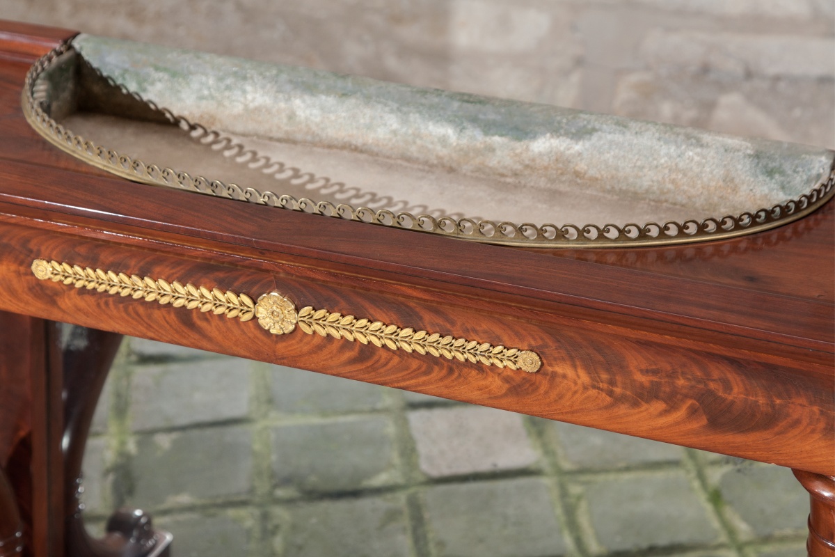CONSOLE jardinière en acajou et placage d'acajou flammé. Deux montants...