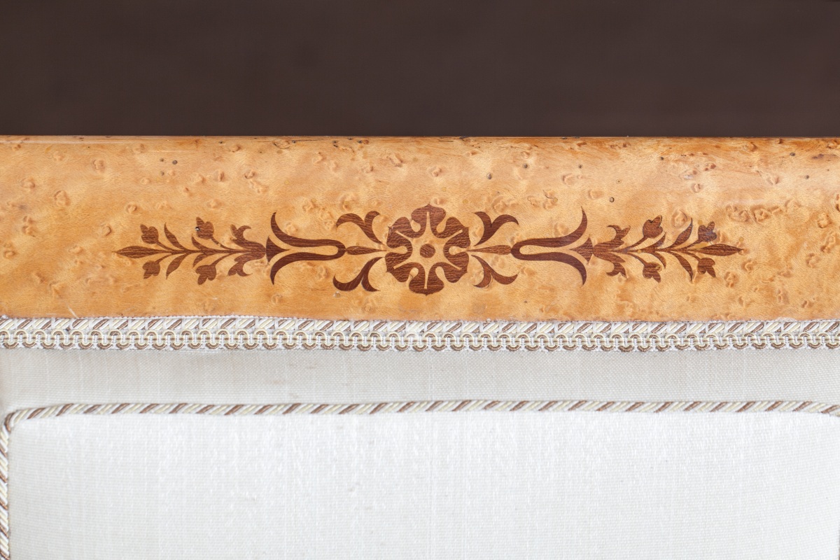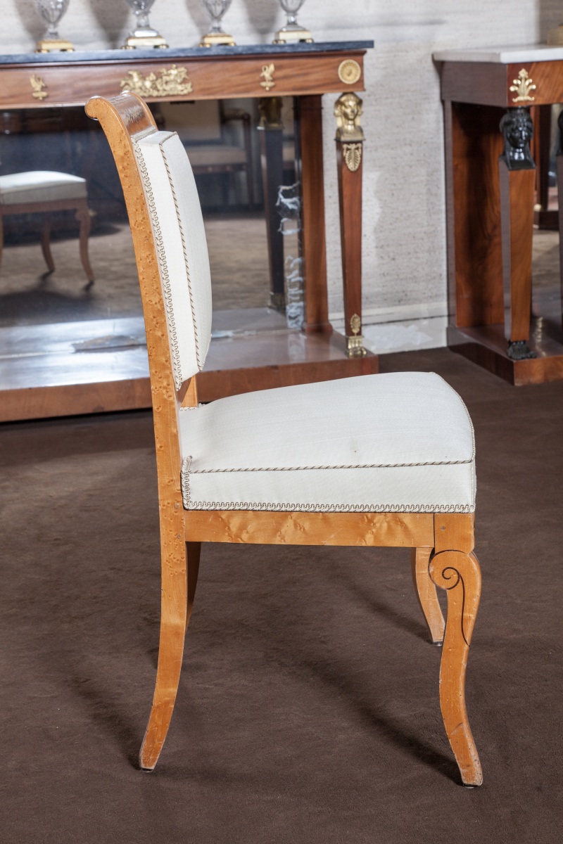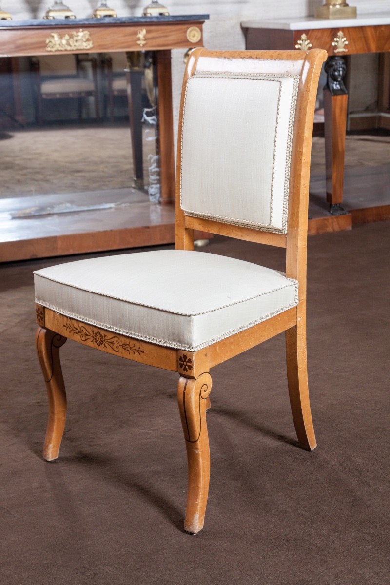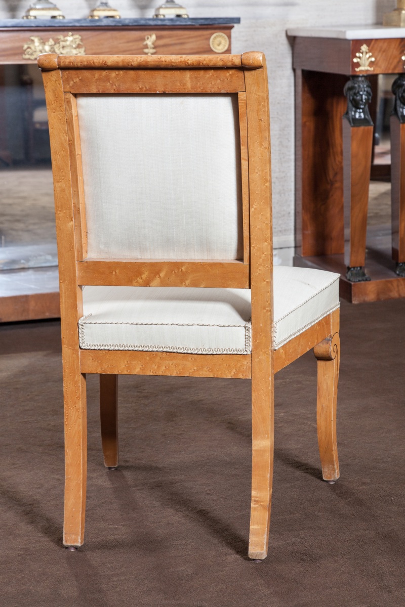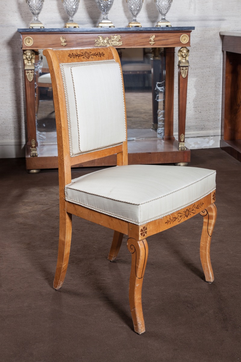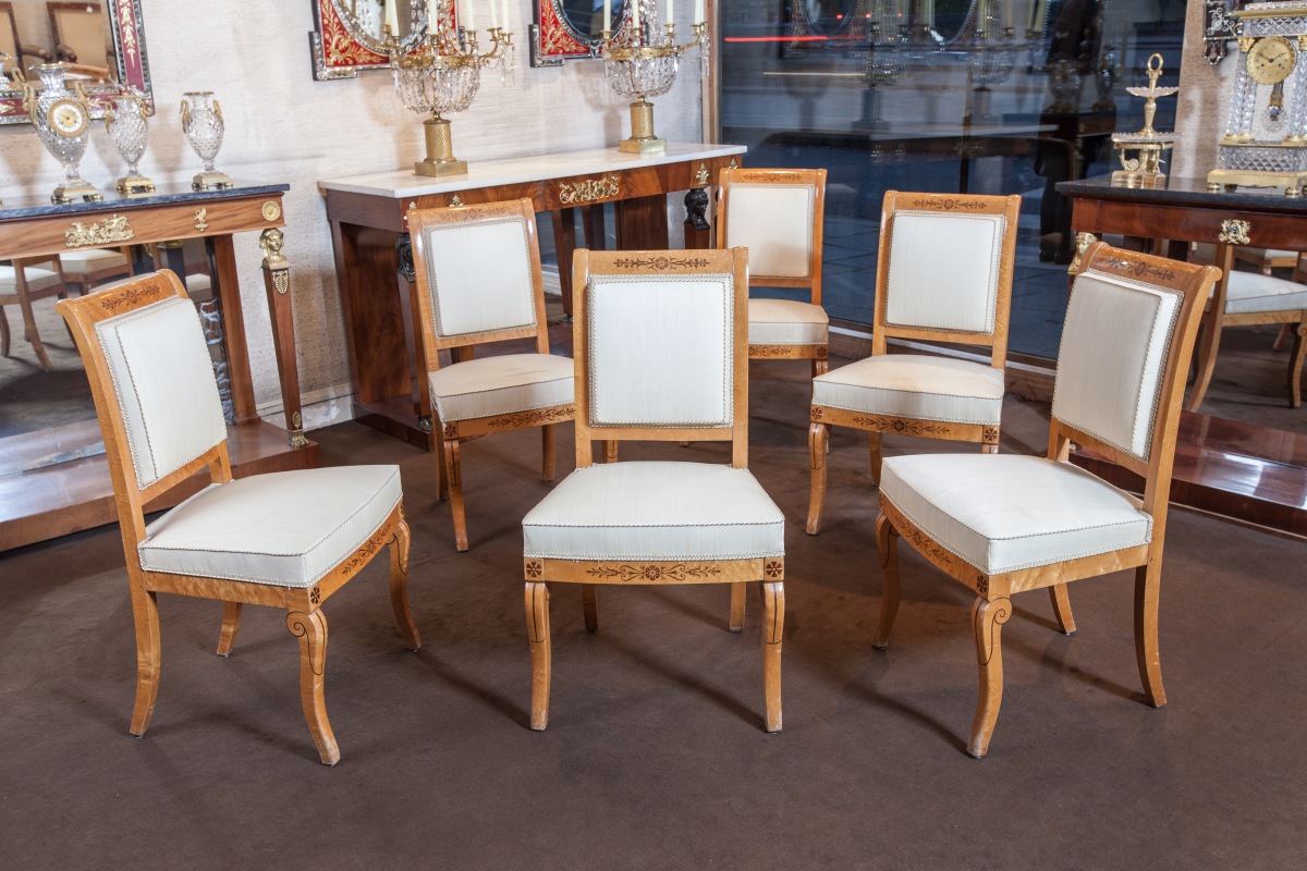 Suite de SIX CHAISES à dossier plat légèrement renversé en érable et loupe d'érable à décor incrusté en amarante de fleurons, branches fleuries et filets. Pieds avants en console, pieds arrières en sabre.