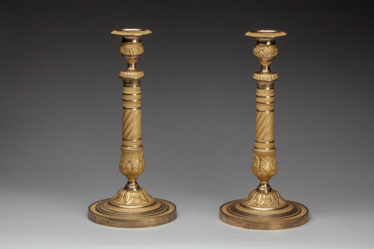 PAIRE de FLAMBEAUX en bronze finement ciselé et doré. Fût balustre, à riche décor mat et bruni de frises de fleurs et de feuillages, terminé par de large feuilles d'acanthe stylisées. La base de forme ronde ornée de même. La bobèche ornée d'une frise d'éventails recevant un binet à frise de feuilles lancéolées.