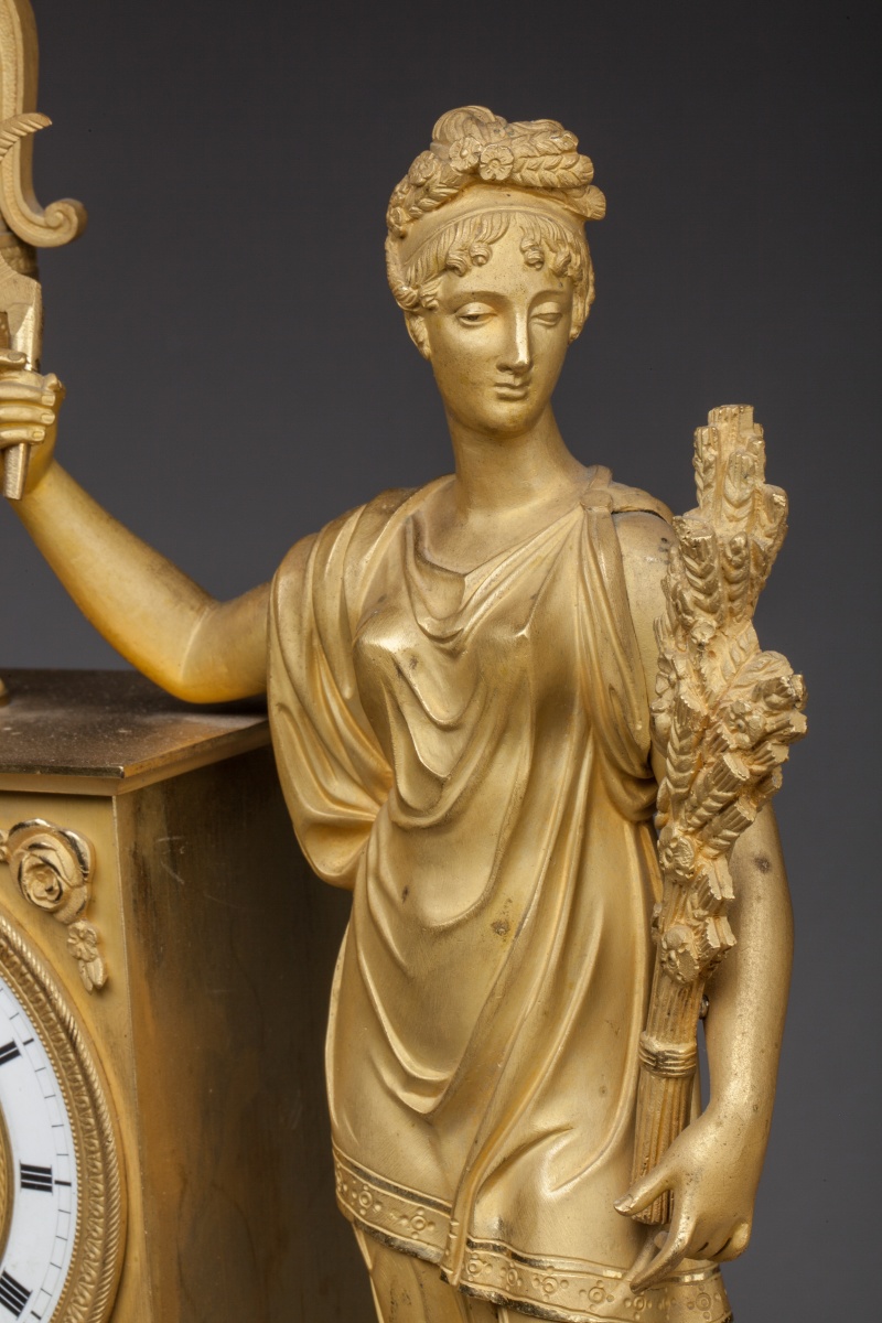 en bronze ciselé et doré figurant la déesse de l'Agriculture qui, coiffée d'une couronne de fleurs, porte de la main gauche une gerbe de blé et de pavots et de la droite, une faucille. Elle se tient à la droite d'une borne sommée d'une amphore qui accueille le cadran. Ce dernier se compose d'un anneau émaillé blanc indiquant les heures en chiffres romains et, au centre, d'un disque guilloché signé "Morache à Avallon". Il est souligné d'une large gerbe de blé et d'oeillets. Sur la gauche de la borne reposent un râteau et un fléau. La base de forme rectangulaire ornée d'un important motif floral figurant fleuron, couronne de fleurs, acanthes, pampres de vignes, thyrses et volutes. Elle repose sur quatre pieds boule à tore de laurier.