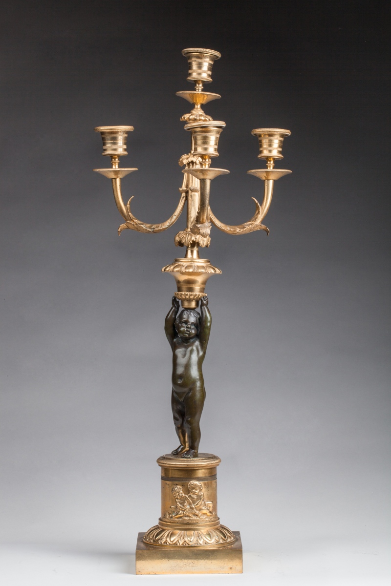 Paire de CANDÉLABRES à quatre lumières en bronze doré et bronze patiné. Bras de lumière adoptant la forme de rinceaux feuillagés. Ils reposent sur une toupie ornée de feuilles d'acanthe et godrons. Fûts figurés par un putto. Base cylindrique à décor appliqué de deux putti jouant avec un oiseau, d'une frise de câble et d'une frise d'oves et dards. L'ensemble repose sur une base carrée.