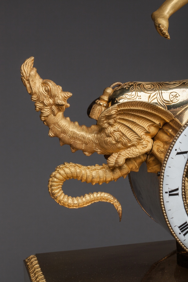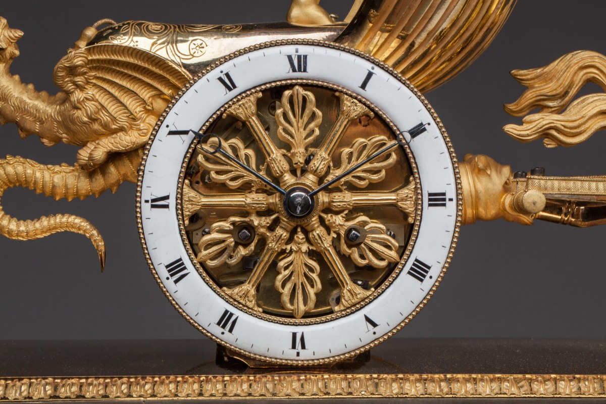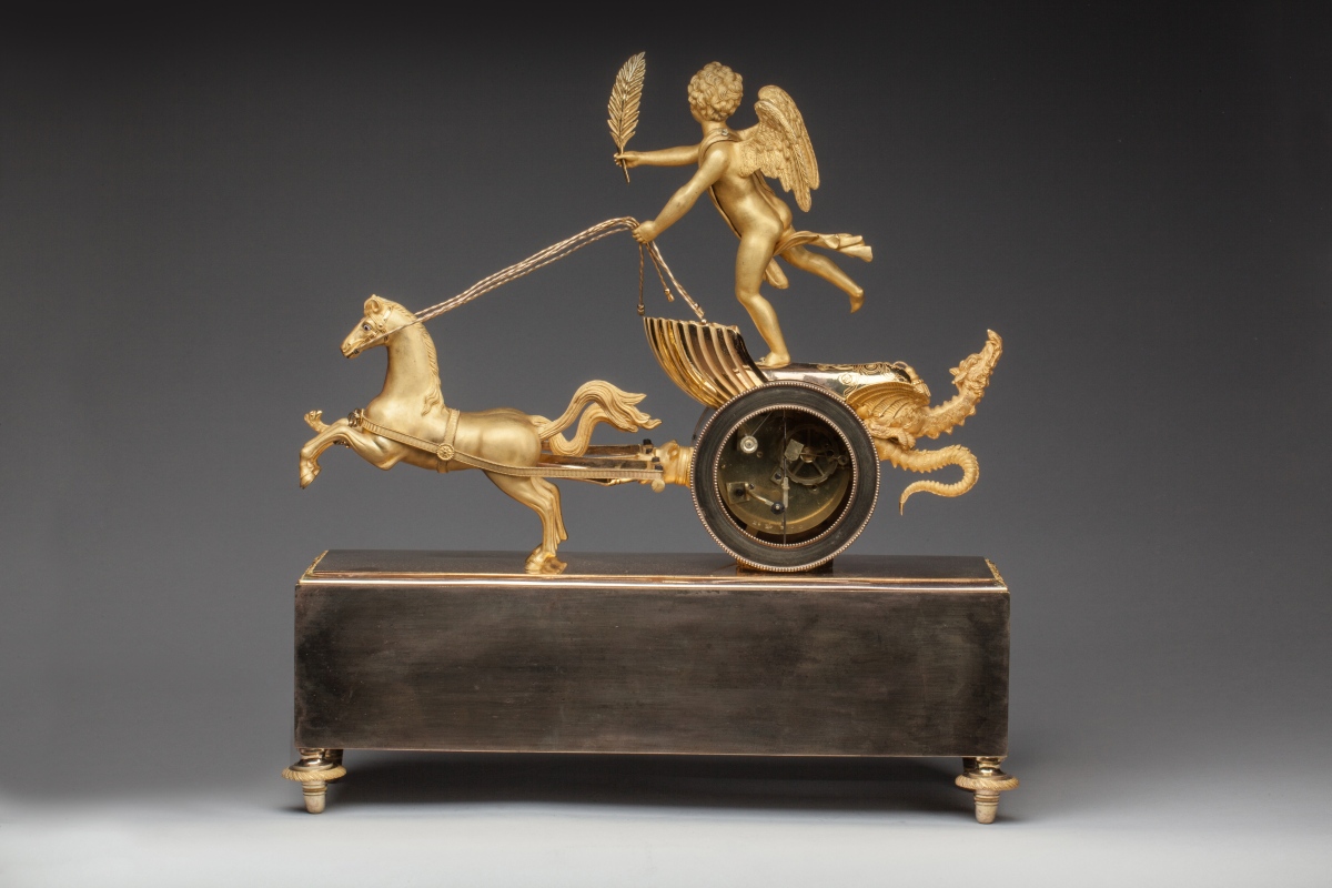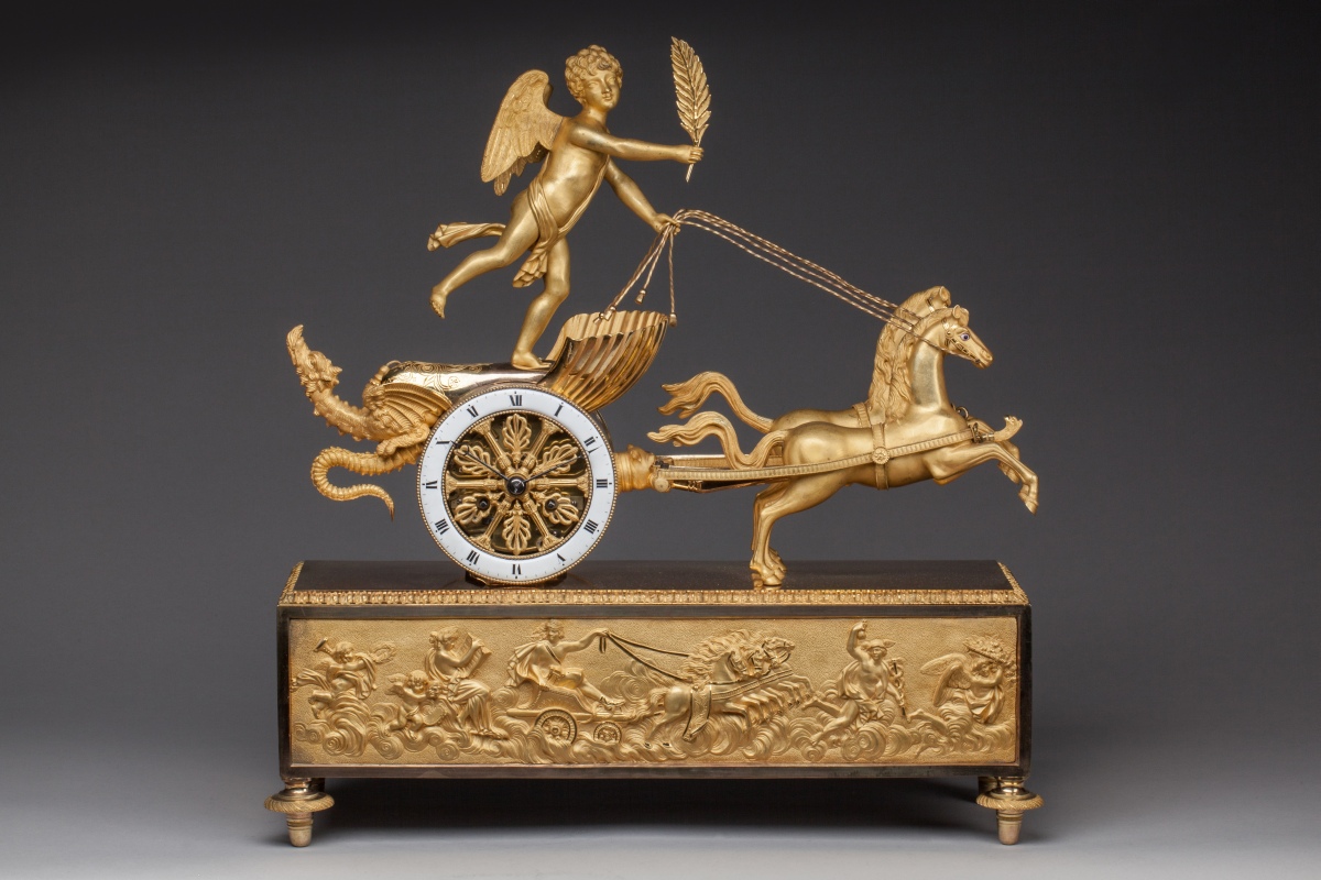 en bronze ciselé et doré représentant Cupidon victorieux, une palme dans la main droite, conduisant son char. Ce dernier adopte la forme d'une coquille, l'arrière figurant une vouivre. Il est tiré par deux chevaux cabrés aux yeux d'émail. Base ornée d'un bas-relief représentant le triomphe d'Apollon ornée d'une frise d'acanthe et reposant sur quatre pieds toupie guillochés. Le cadran en émail blanc indiquant les heures en chiffres romains et le mouvement squelette s'inscrivent dans la roue dont les rayons en colonne feuillagée alternent avec une palmette.