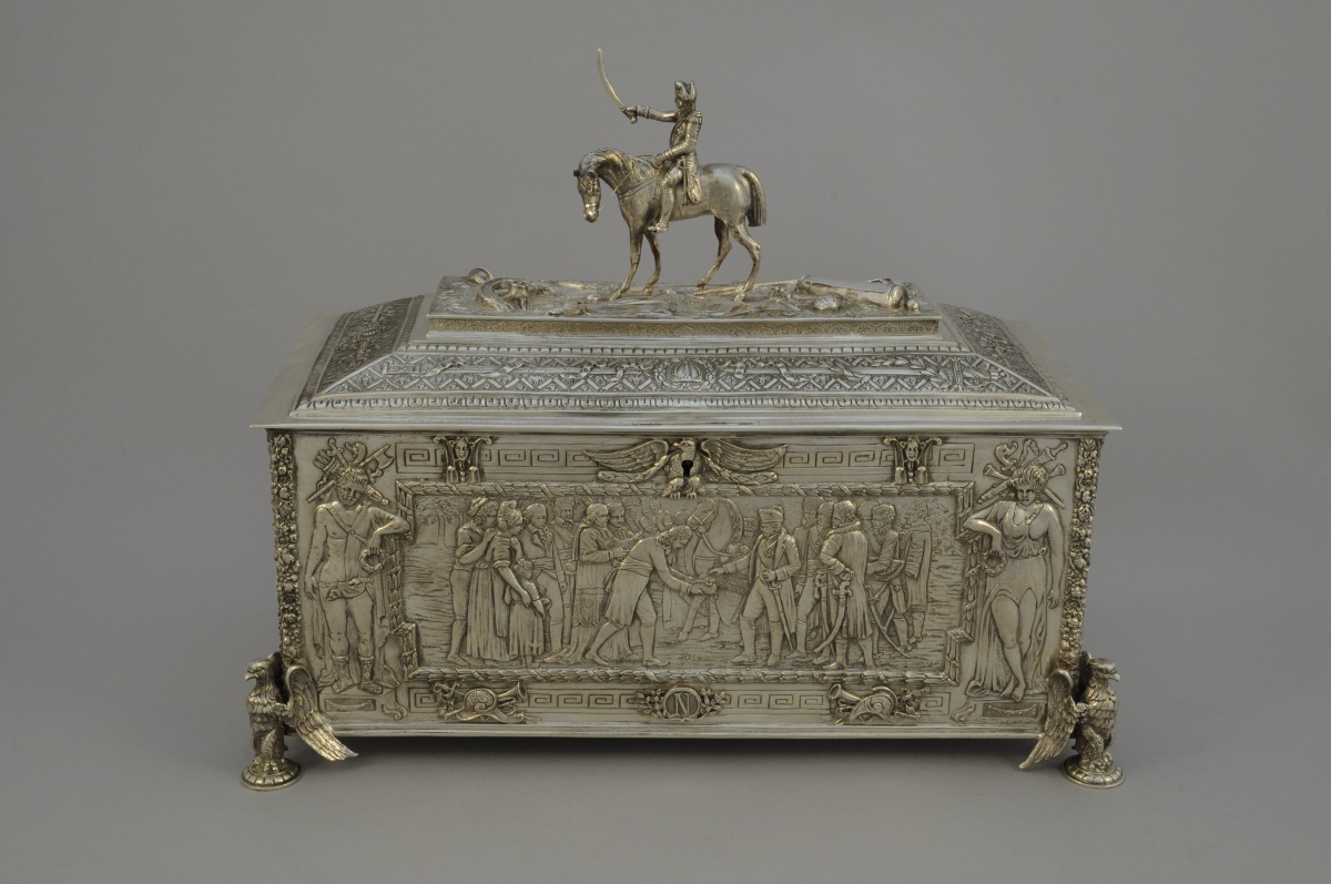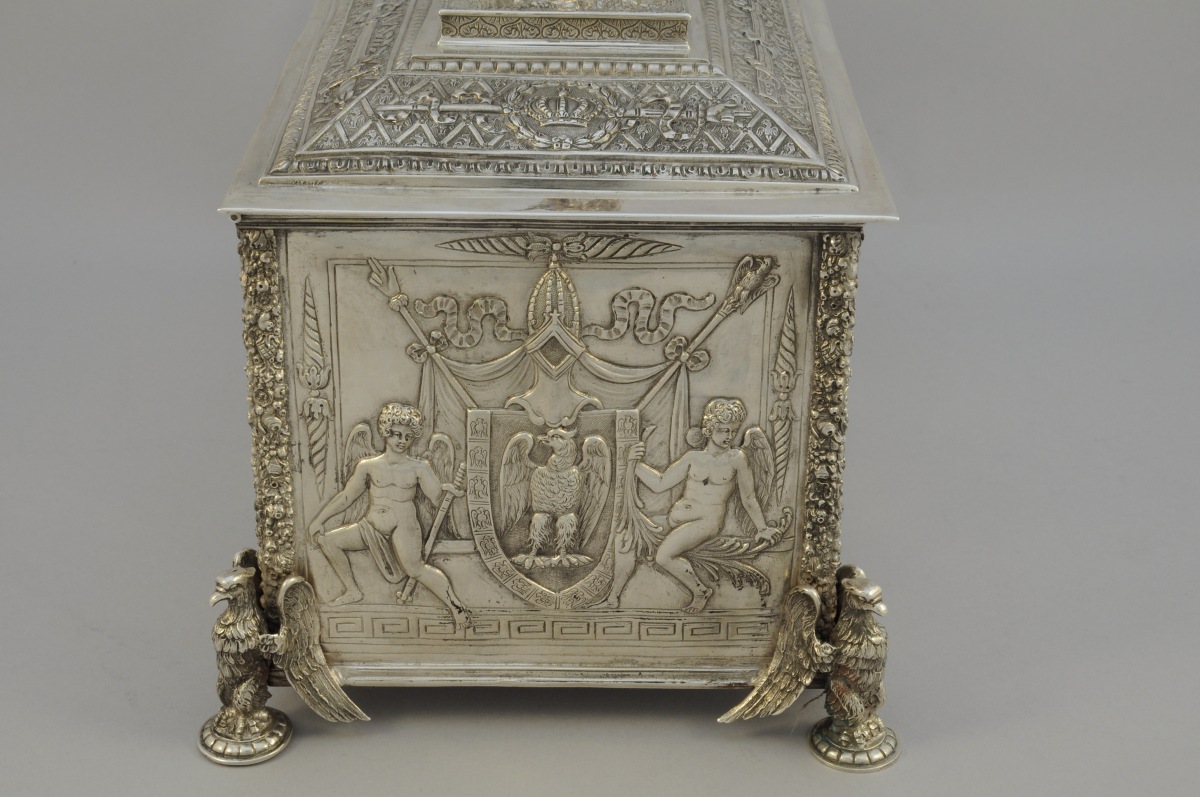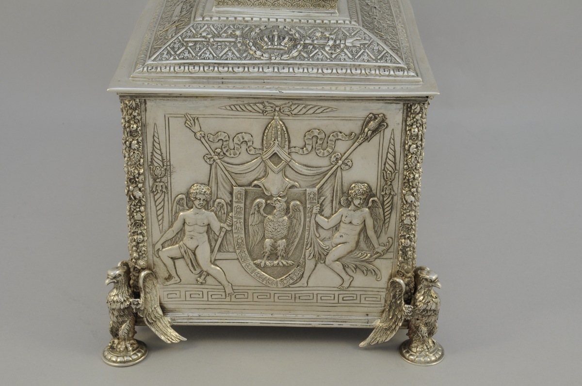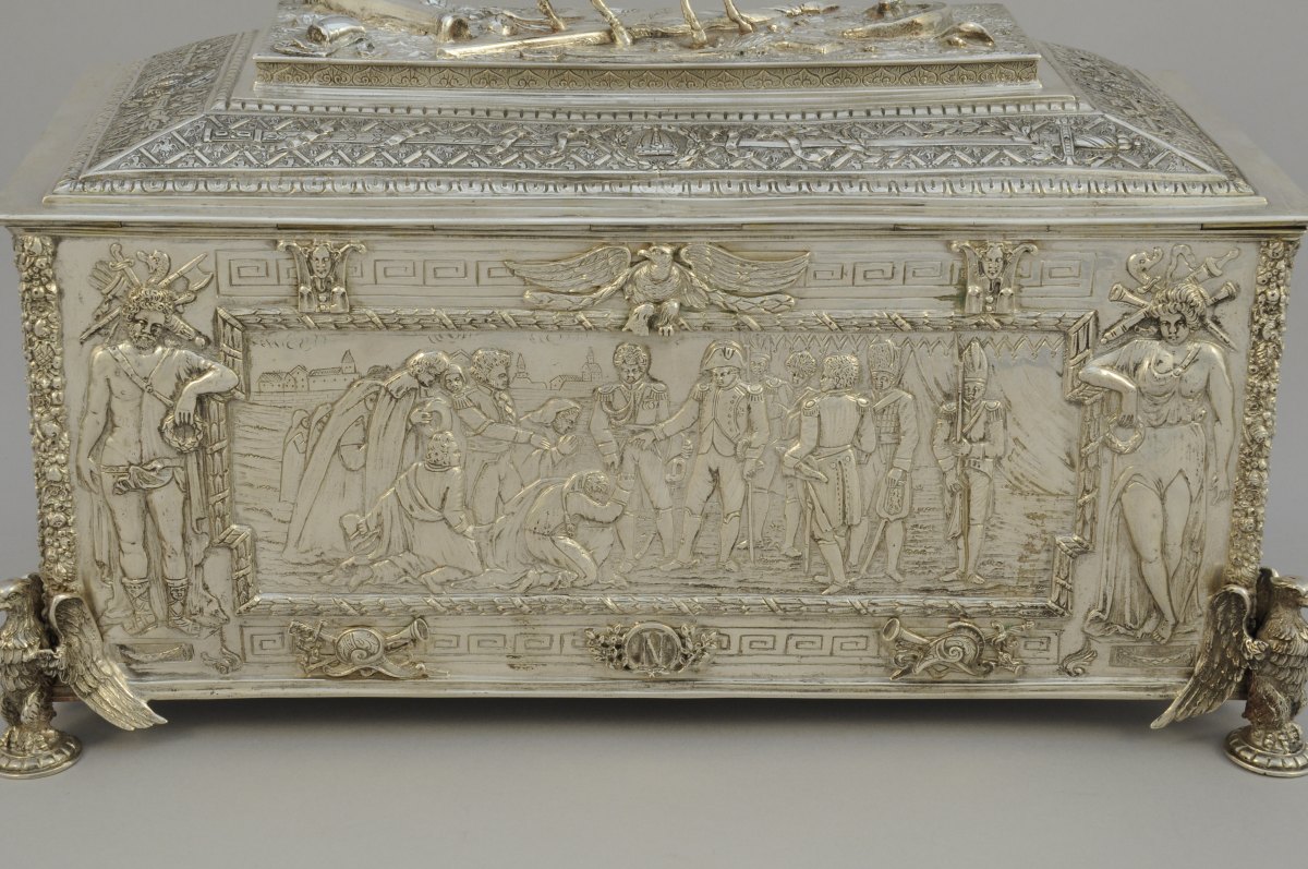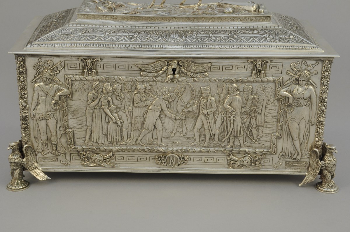 COFFRET allégorique de l'Empire en argent de forme parallépipédique, reposant sur 4 aigles aux ailes déployées aux coins. Armes de l'Empire sur les cotés, et reproduction en façade et à l'arrière des tableaux d'Horace Vernet " Napoléon devant Madrid, le 3 décembre 1808 " et de Girodet de Roucy Trioson " Napoléon reçoit les clefs de Vienne à Schönbrunn, le 13 novembre 1805 ".