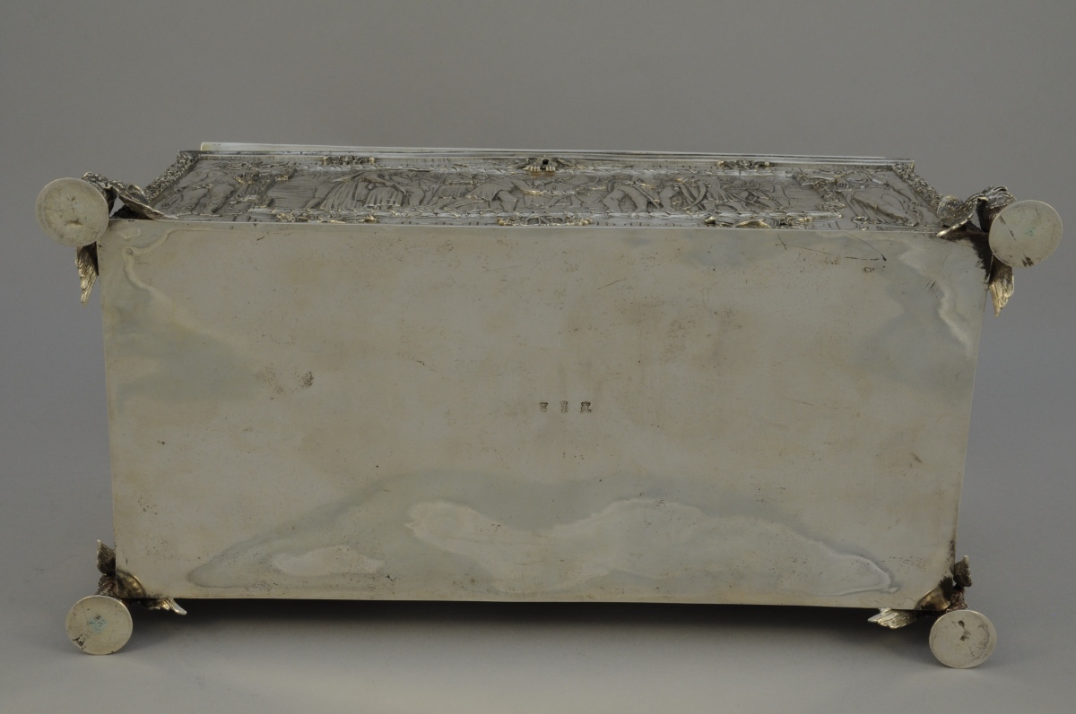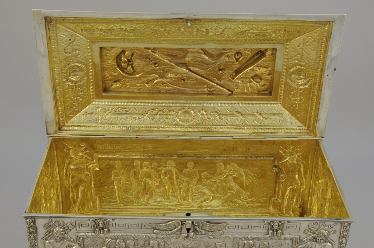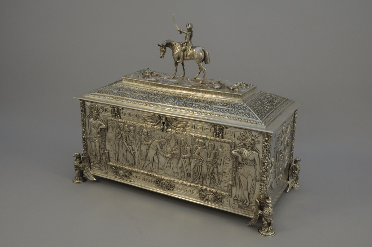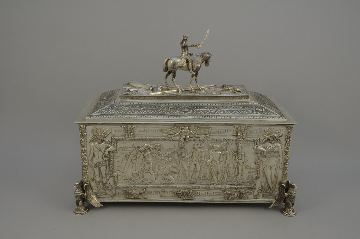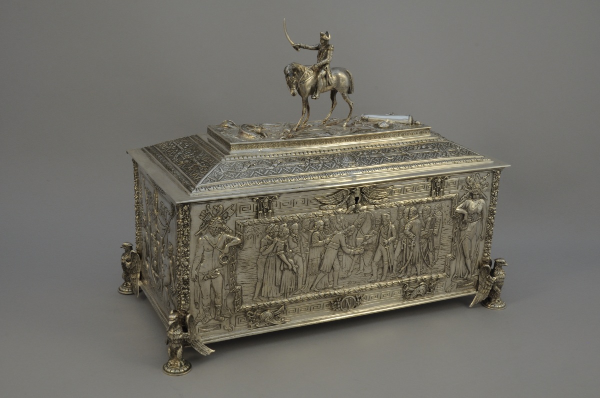 COFFRET allégorique de l'Empire en argent de forme parallépipédique, reposant sur 4 aigles aux ailes déployées aux coins. Armes de l'Empire sur les cotés, et reproduction en façade et à l'arrière des tableaux d'Horace Vernet " Napoléon devant Madrid, le 3 décembre 1808 " et de Girodet de Roucy Trioson " Napoléon reçoit les clefs de Vienne à Schönbrunn, le 13 novembre 1805 ".