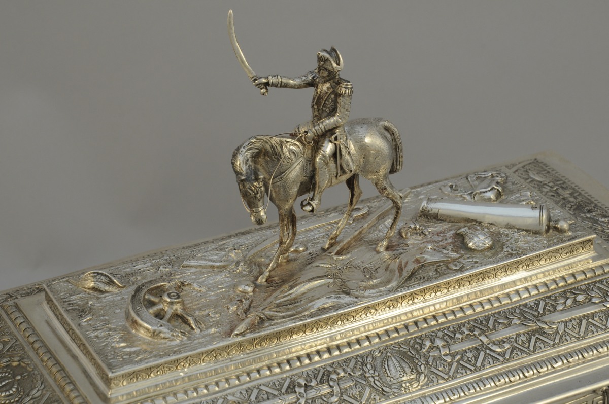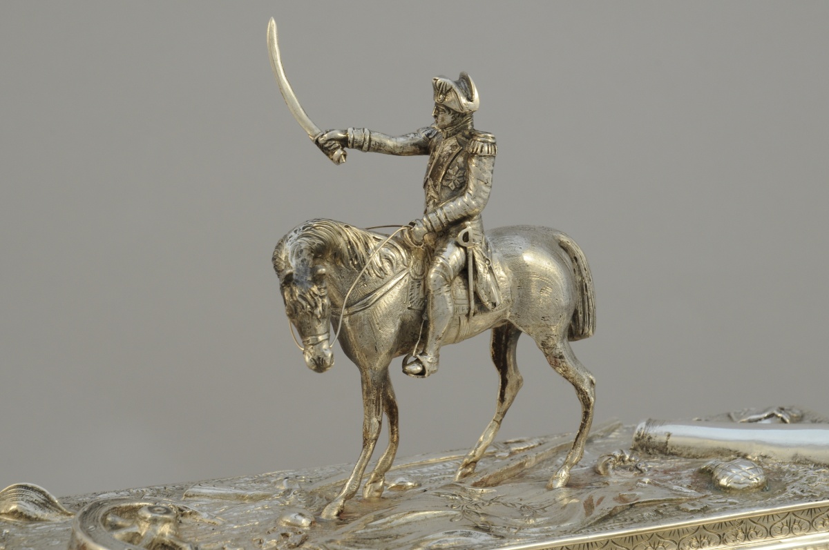 Couvercle représentant Napoléon en ronde bosse, L'Empereur à cheval brandissant son sabre. Riche répertoire iconographique de l'épopée impériale : glaive, couronne, initiale, trophées, Victoire.