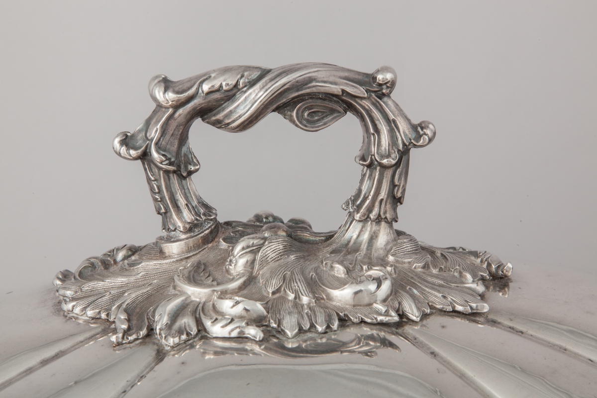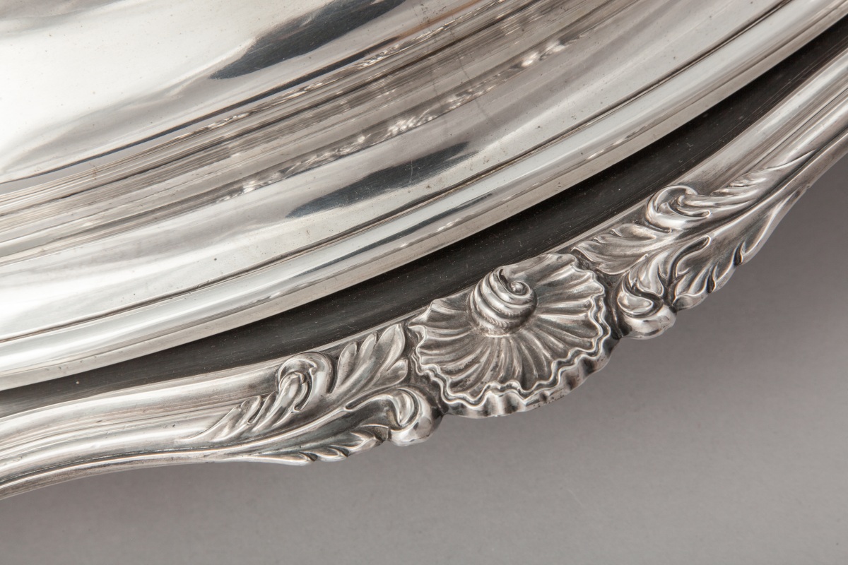 PLAT à rôt comprenant une rigole. Bords à filets, feuilles d'acanthe stylisées et coquilles. Anses-poignées à coquille et feuillage stylisé se prolongeant pour former les quatre pieds terminés par un ombilic. Doublure dans le plat pour permettre l'usage du bain marie. Bouchon.