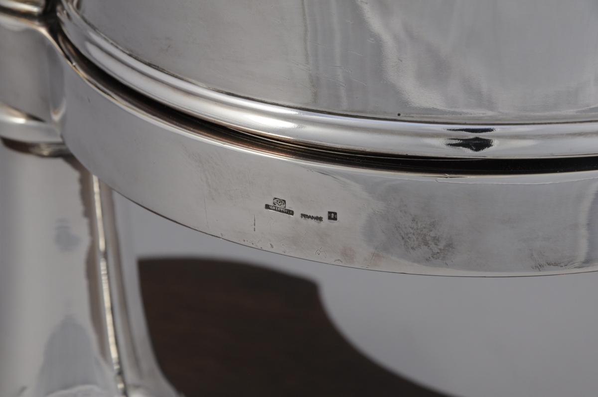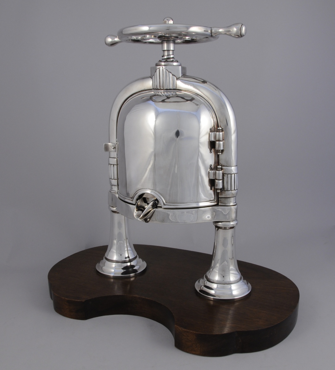 Toujours proposée dans le catalogue de la maison Christofle, la presse à canard est une pièce de haute orfèvrerie, créée à la demande, nécessitant plus de 150 heures de travail. C'est un objet de qualité, typique dhôtellerie pour réaliser le canard au sang, dont le restaurant " La Tour dArgent " à Paris sest fait une spécialité. Cette recette implique une sélection des canards avant abattage qui doivent être étouffés et non saignés pour garder leur sang. Une fois cuit, le volatile est découpé devant l'hôte, la carcasse, placée dans la presse, est toujours écrasée devant le convive. Sur socle en bois, la presse est actionnée par un volant qui fait tourner la vis écrasant la carcasse placée dans son réceptacle ajouré. Le jus s'écoule alors dans le récipient placé sous le bec. La porte frontale permet d'éviter les projections pendant l'écrasement.