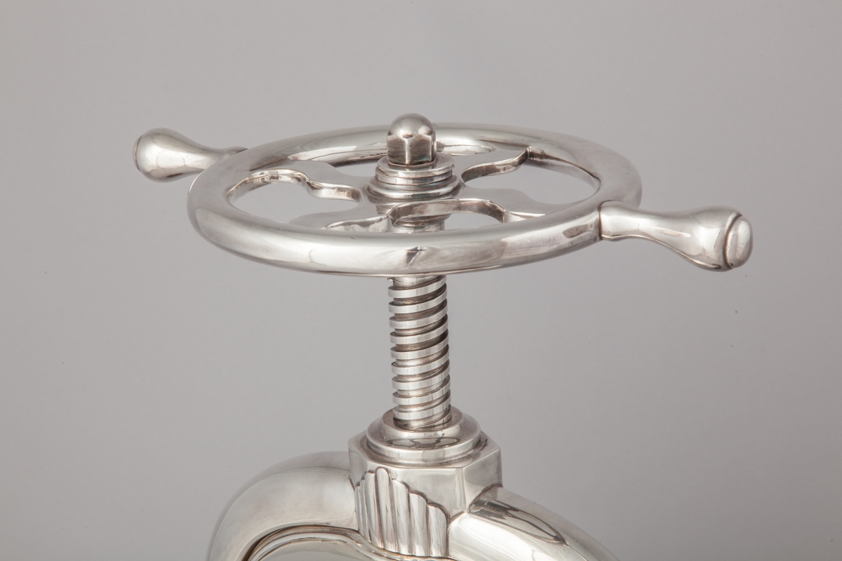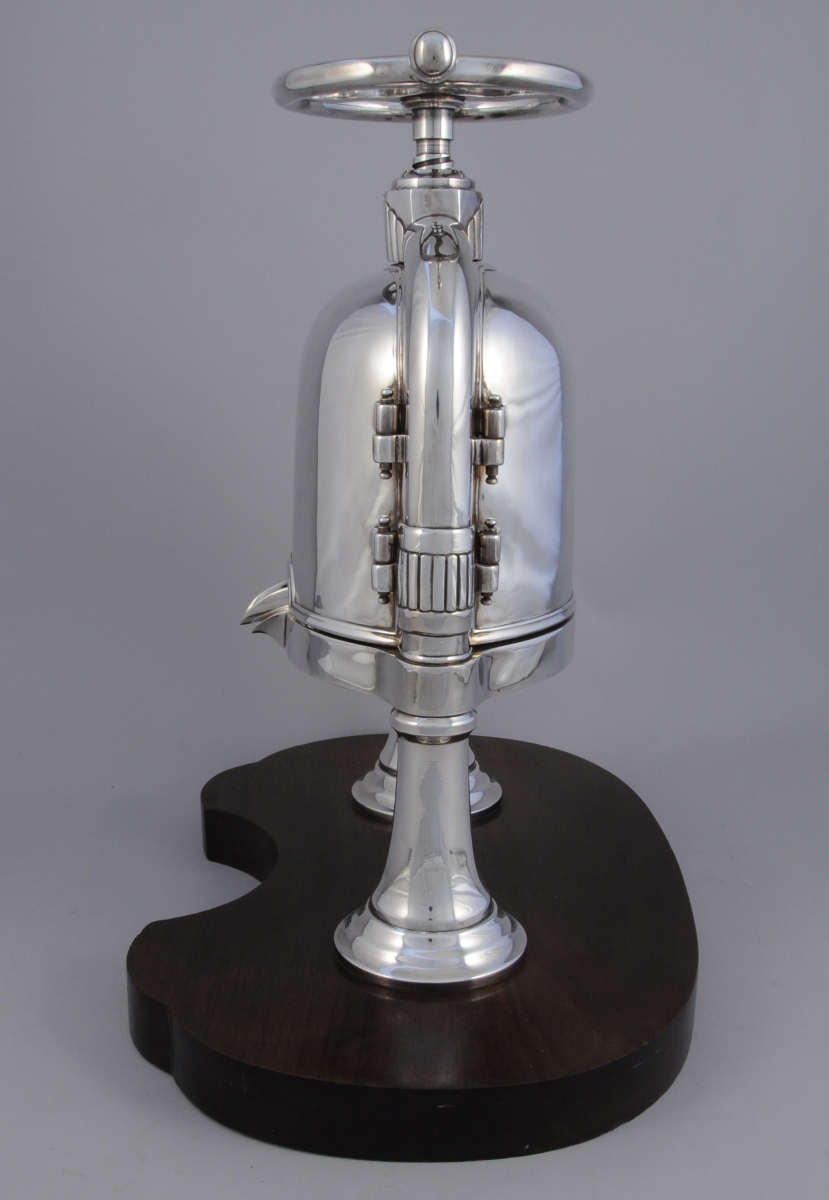 en métal argenté. Système fait d'une roue stylisée à deux poignées.