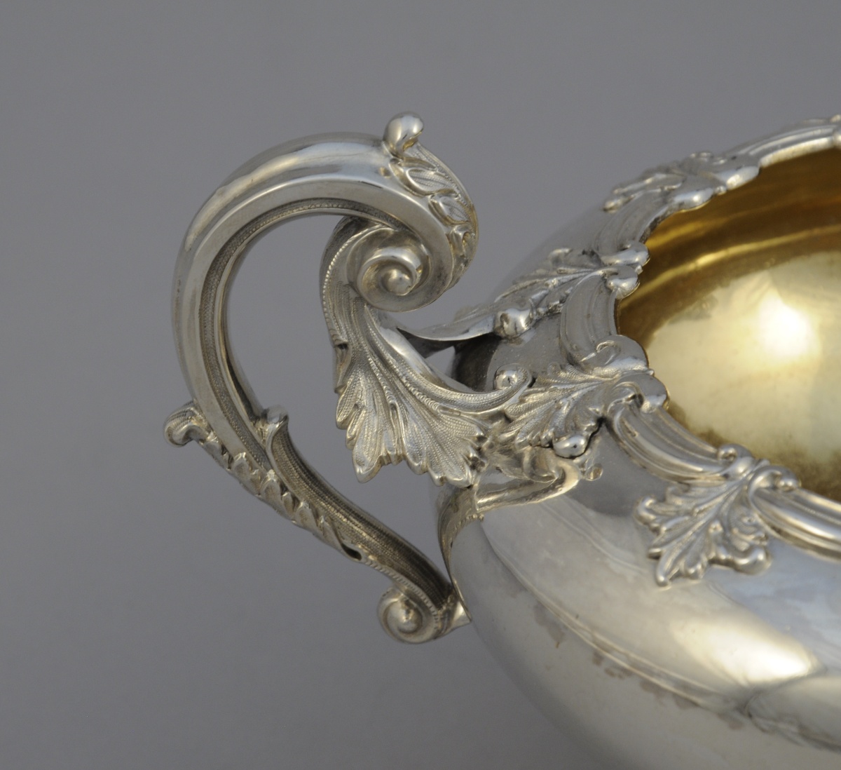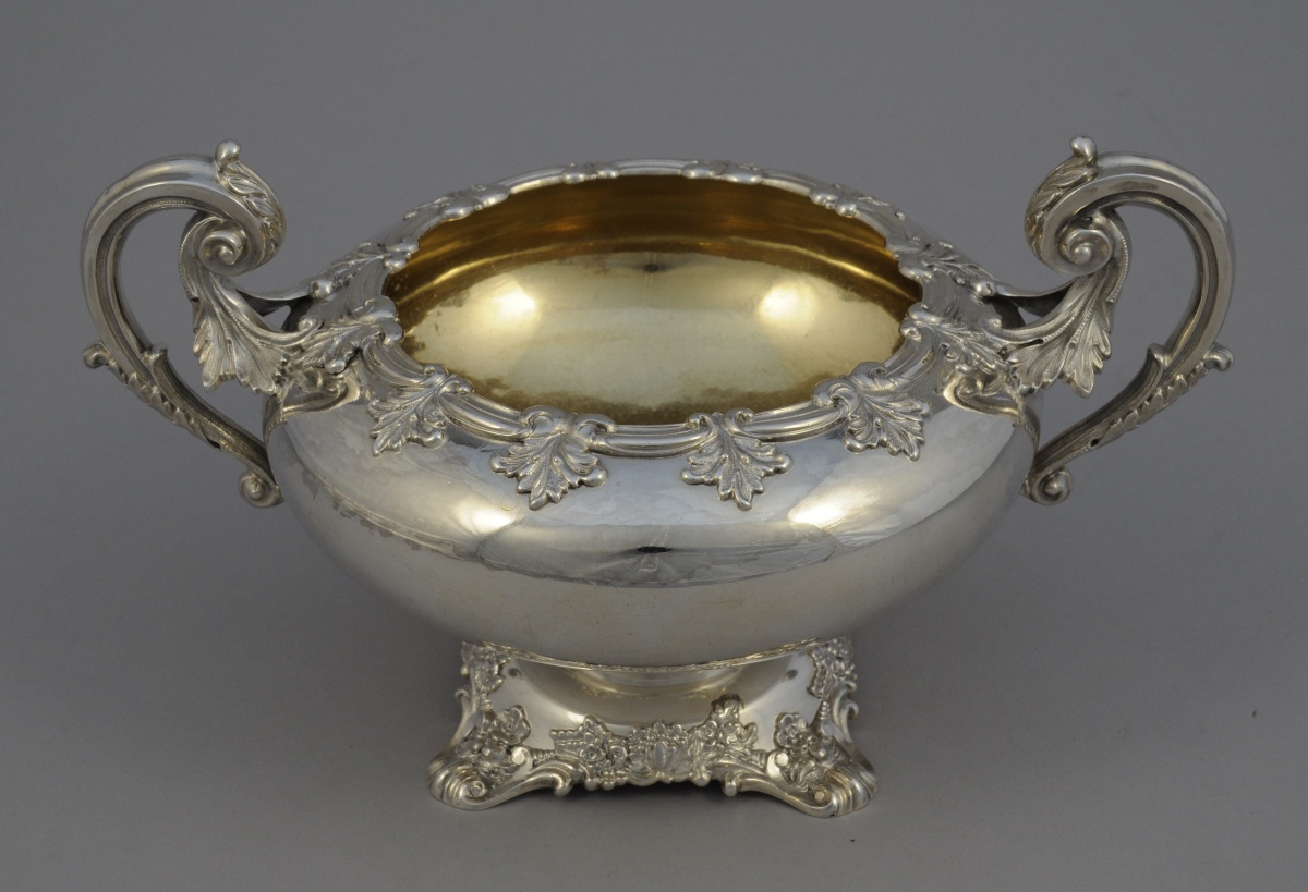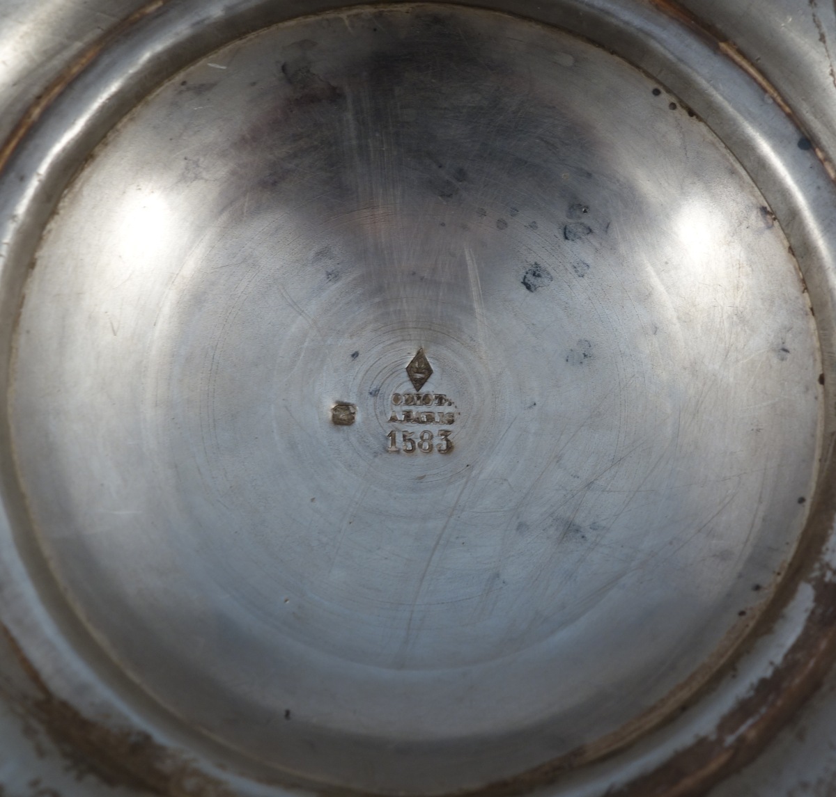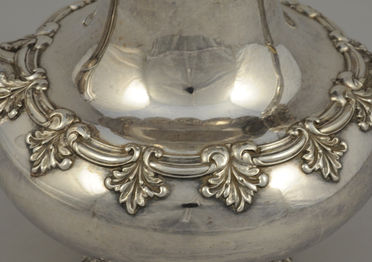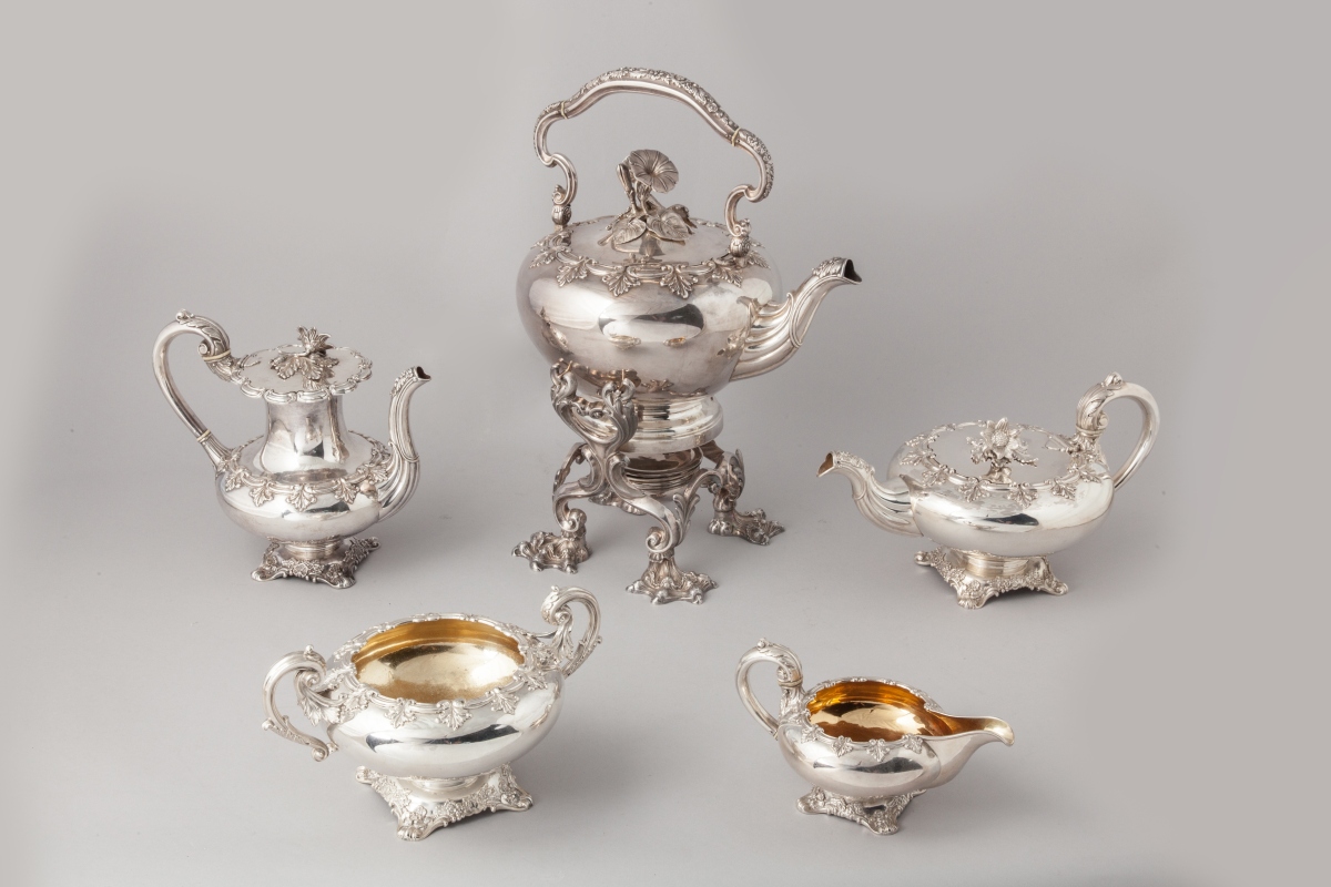 Décor de frises d'agrafes alternées de feuilles d'acanthe et motifs floraux. Il se compose d'un samovar et de son réchaud, d'une théière, d'une cafetière, d'un sucrier et d'un pot-à-lait. Le samovar à anse en accolade baguée d'ivoire, le bec-verseur godronné. Le fretel figurant deux fleurs épanouies et un bouton sur une terrasse feuillagée. Support reposant sur piètement quadripode à pattes de canard. Les autres pièces à anse volute baguée d'ivoire. Le sucrier à anses latérales à attaches feuillagées. Reposent sur un piètement à quatre pieds à enroulements.