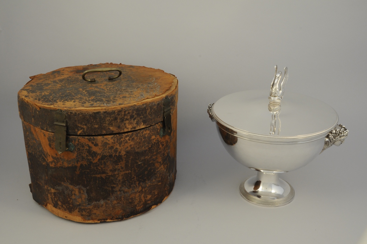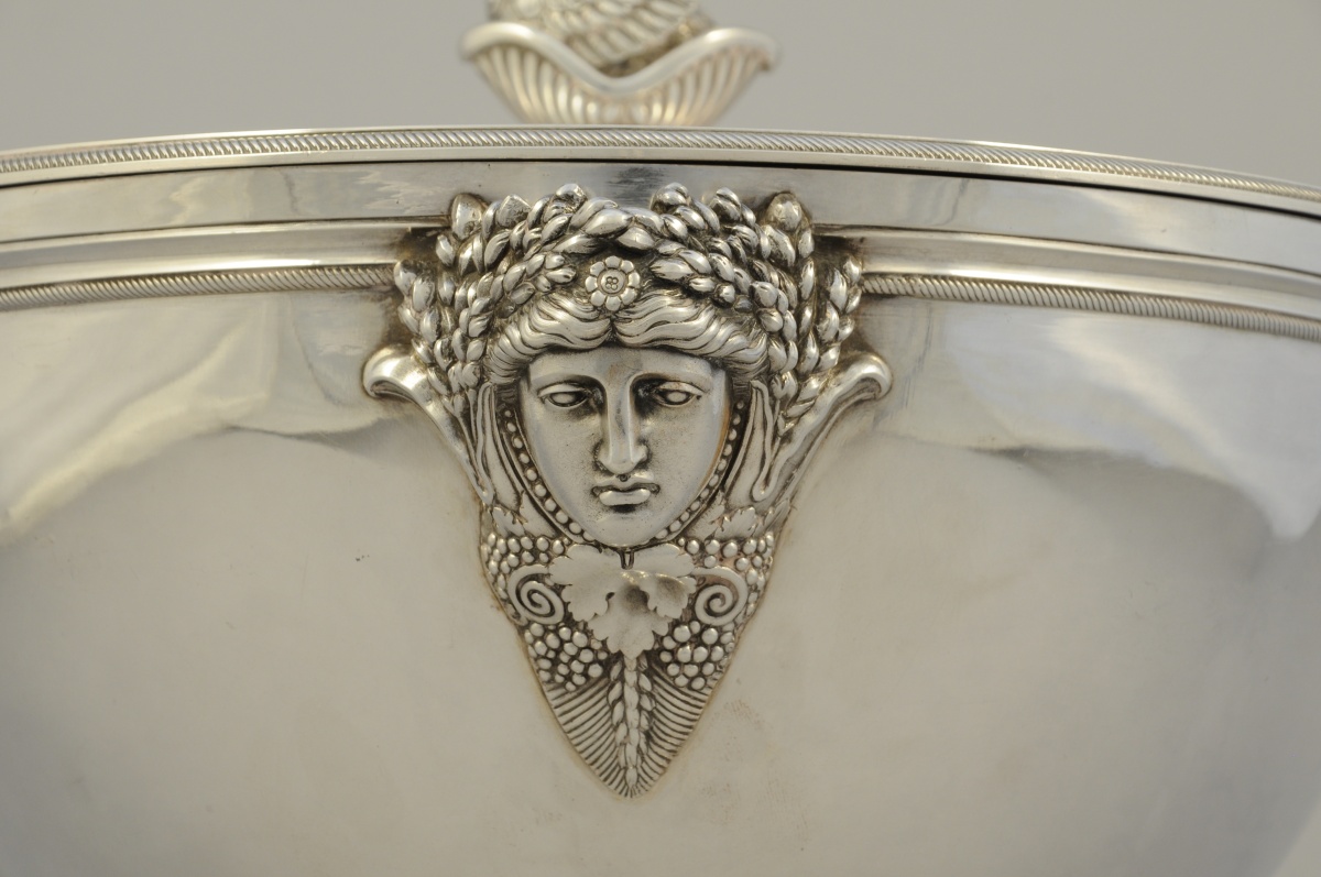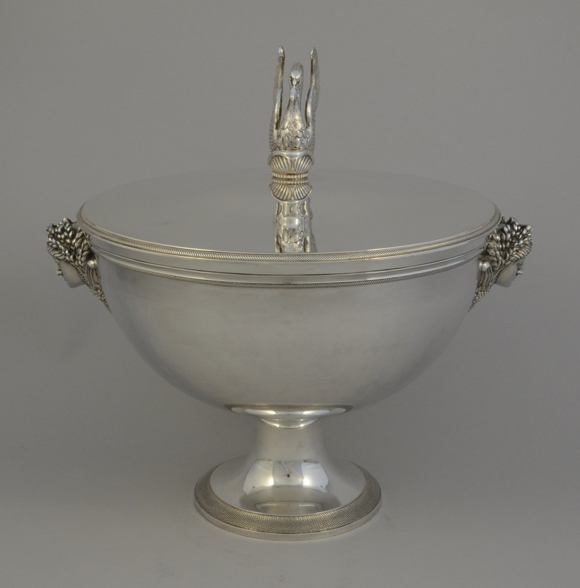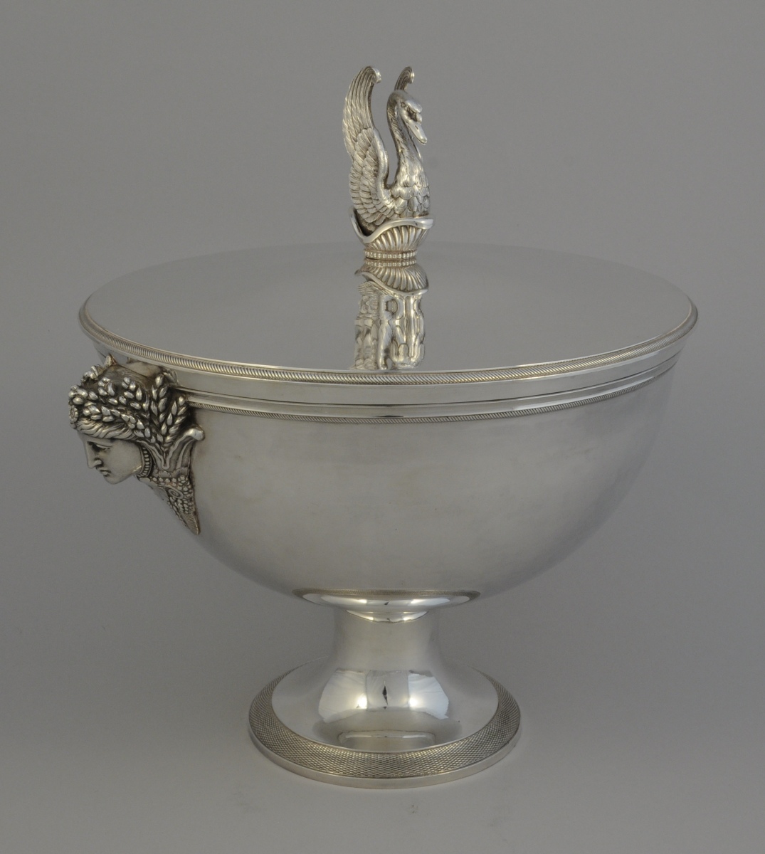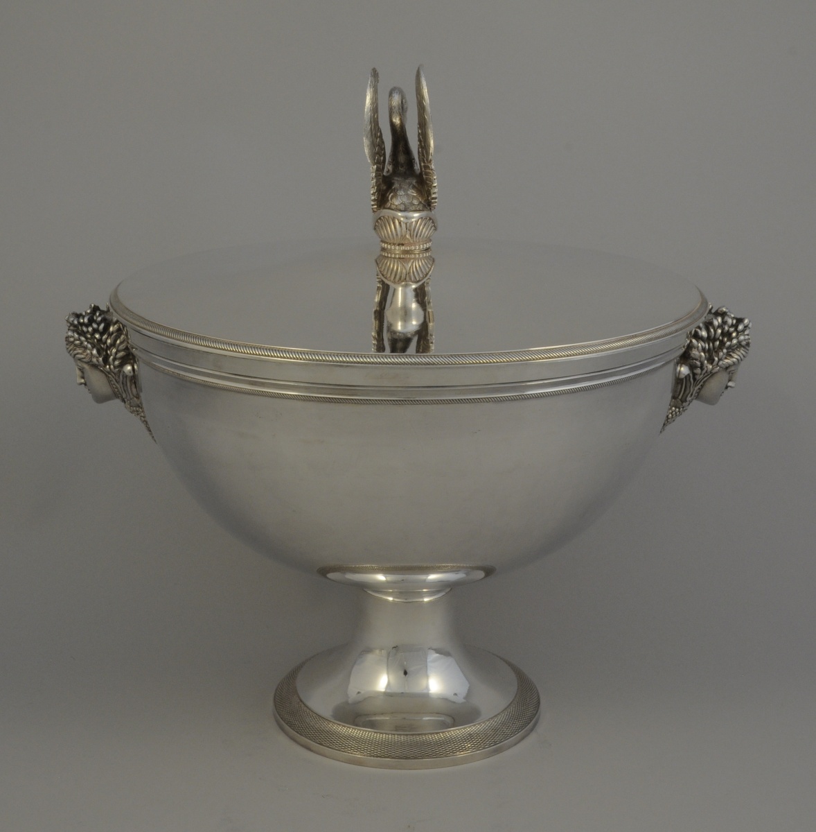 POT À OILLE de forme ronde et sa doublure en argent uni. Il pose sur un piédouche bordé de guillochis. Les contours du couvercle et du col ciselés d'une frise de câbles. Les anses latérales adoptent la forme d'une tête de Cérès finement ciselée et soulignée de pampres de vigne et d'un épi de blé rayonnant. Le fretel figure un cygne naissant d'un réceptacle oblong orné de palmettes.