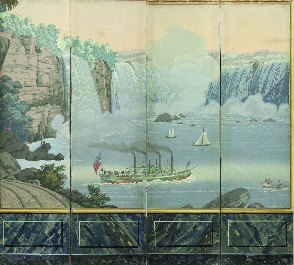 à quatre feuilles en papier-peint de la Manufacture "ZUBER et cie" figurant "les chutes du Niagara" et au premier plan le bateau Erié animé de personnages.