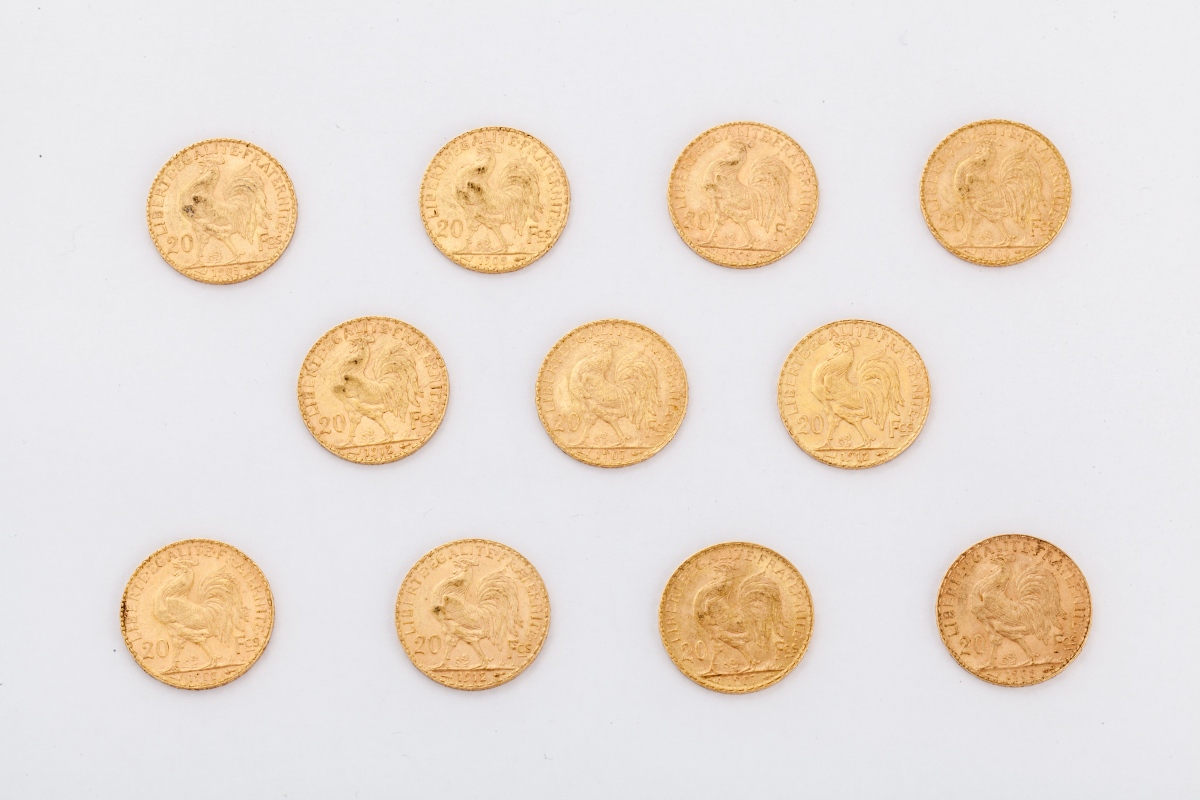 FRANCE. 11 pièces de 20 francs or, coq (1903 x 2, 1904, 1907 x 2, 1908 x 3, 1912 x 3)