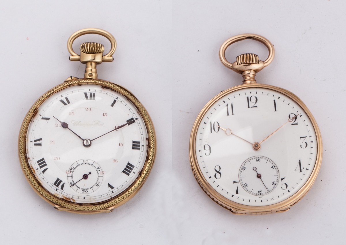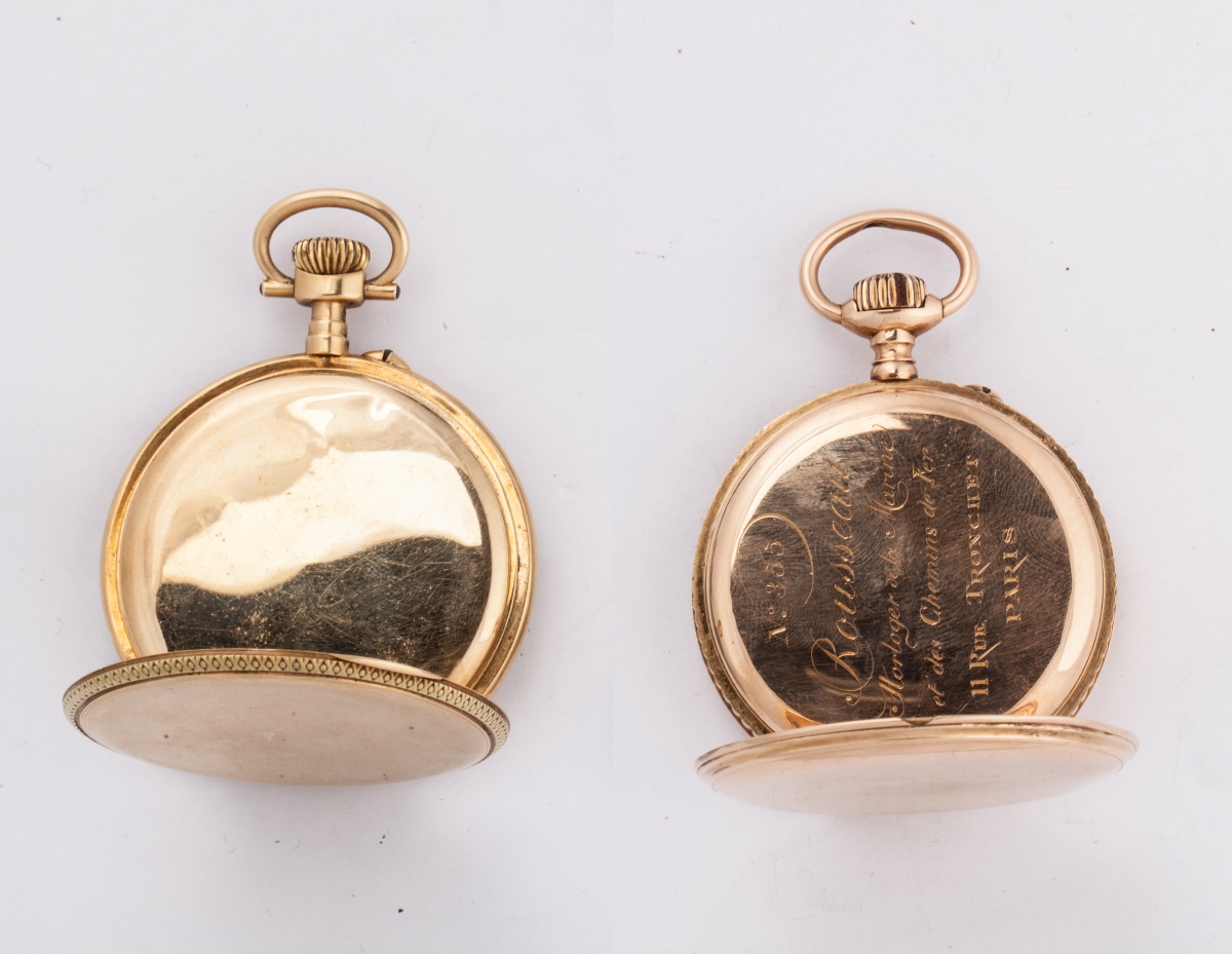 2 MONTRES de GOUSSET en or, à remontoir au pendant, le double cadran émaillé à fond blanc. L'une indique les heures en chiffres romains et les minutes en chiffres arabes. Le pourtour du cadran décorés de deux frises de losanges.