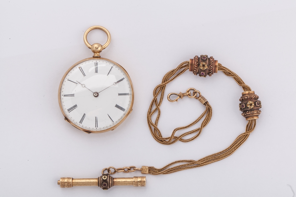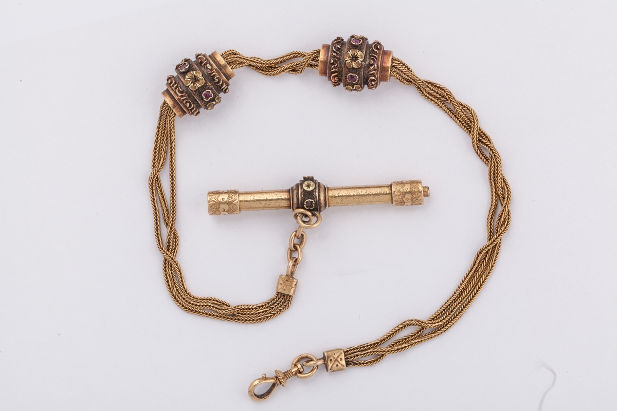 Joint : CHAÎNE GILETIÈRE en or jaune ornée de pierers rouges en cabochon, une extrémité formant clé. Long. 29 cm.