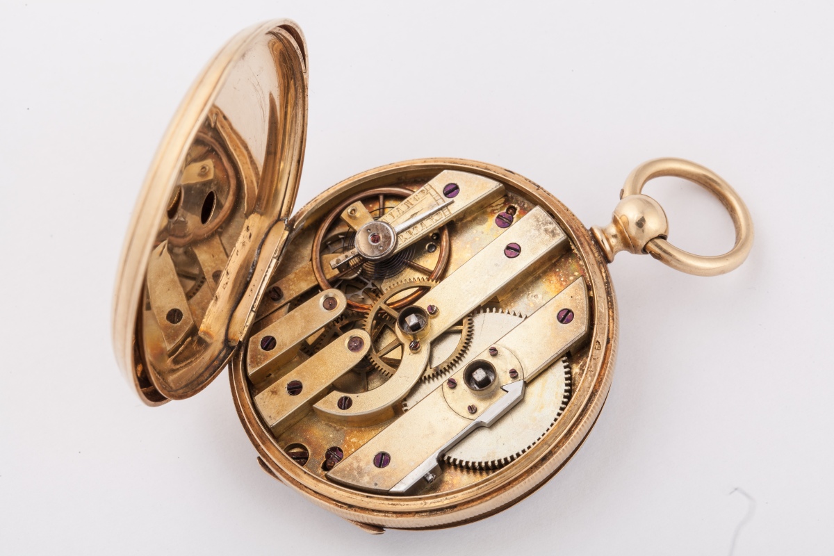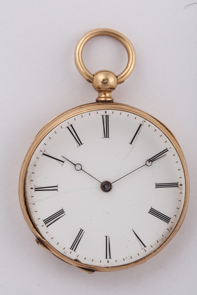 MONTRE GOUSSET en or jaune, le cadrant à chiffre romain, gradué pour les minutes. Le boitier orné d'un écusson dans un entourage de feuillages et de de guillochis. mécanisme cylindre à huit rubis. Diam. 4 cm.