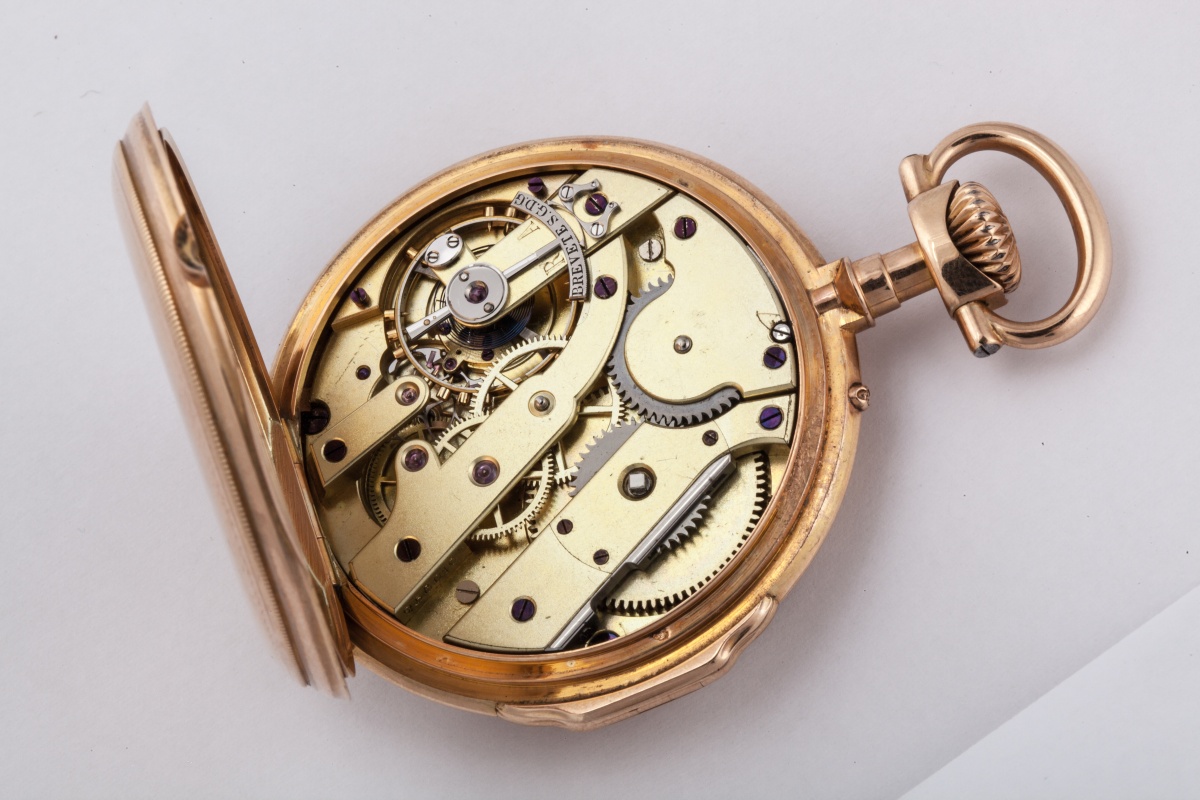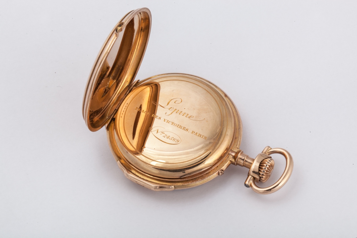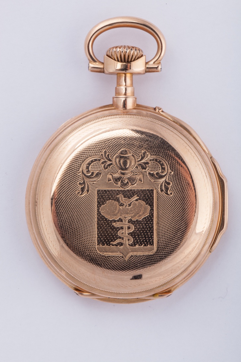 LEPINE. MONTRE de GOUSSET en or, à remontoir au pendant. Double cadran émaillé indiquant les heures en chiffres romains et les secondes en chiffres arabes. Le boîtier sur fond de décors guilloché, centré d'un blason figurant un serpent entourant un arbre et un oiseau dans sa cime. Le blason est coiffé d'un armet et de volutes. Boîtier numéroté "24569".