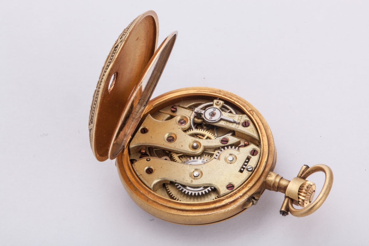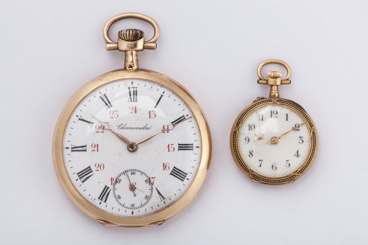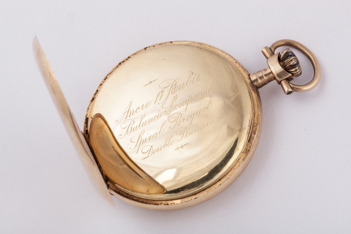 - CHRONOMETRE de gousset. Double cadran émaillé blanc, indiquant les heures du matin en chiffres romains, les heures de l'après-midi en chiffres arabes. Signée "ANCRE 17 RUBIS BALANCIER COMPENSE SPIRAL BREGUET DOUBLE PLATEAU" et numérotée "536677".