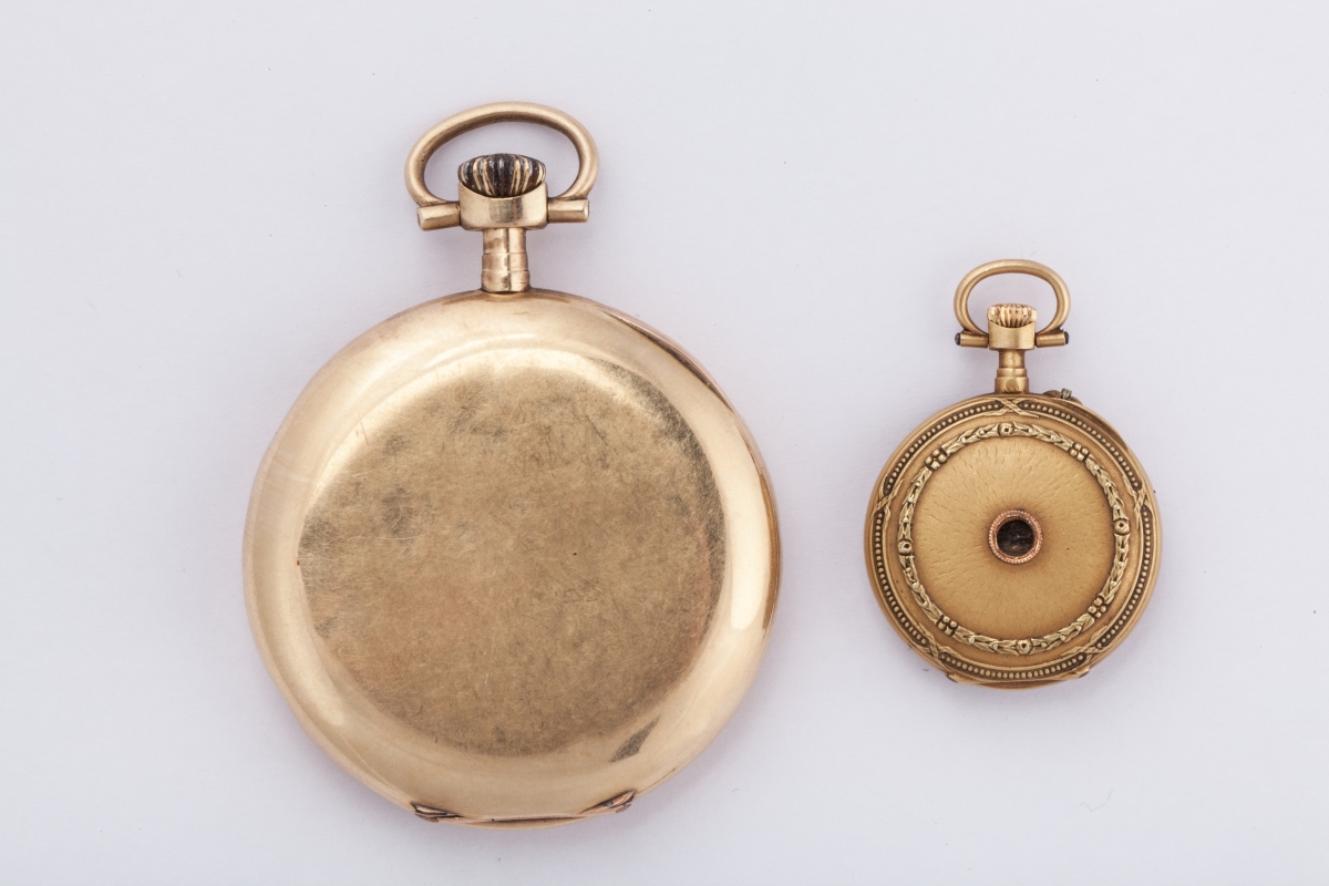 - MONTRE de COL, cadran émaillé blanc indiquant les heures en chiffres arabes. Le boîtier percé en son centre, décoré de deux rangs, l'un de perles et rubans, l'autre de lauriers. (accidents au verre)