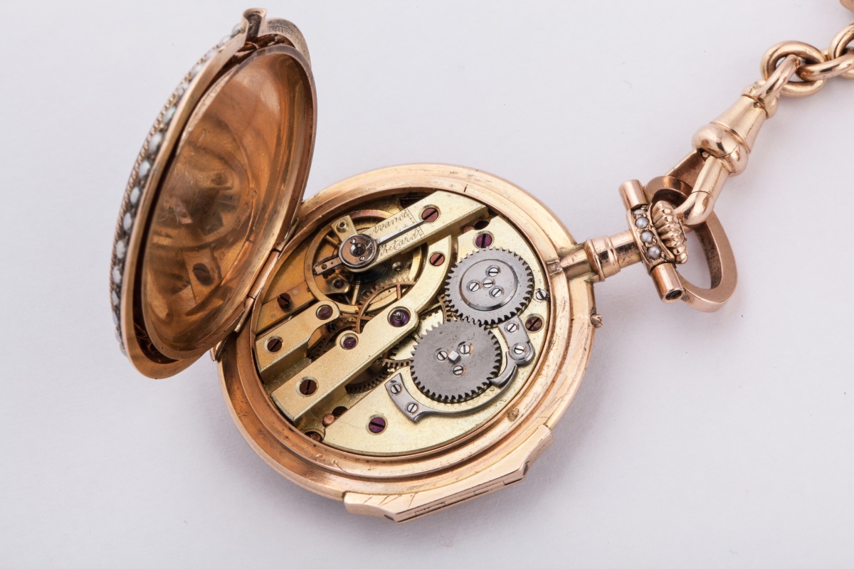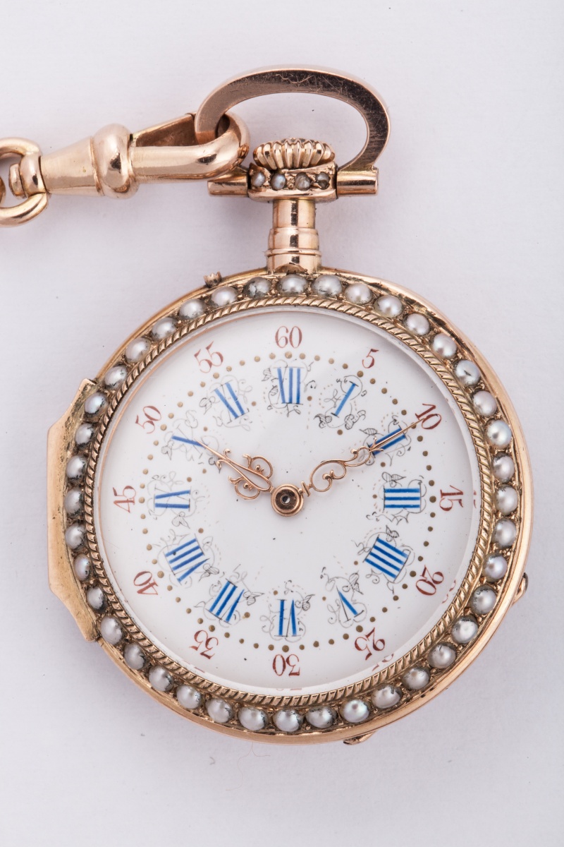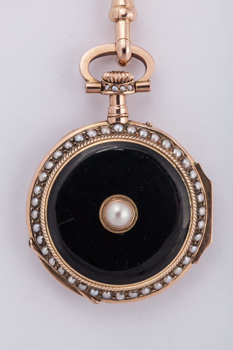 CHATELAINE en or jaune ornée de perles. La barette d'accrochage supporte trois chaînettes. L'une retient une MONTRE en or, le cadran émaillé blanc indiquant les heures en chiffres romains et les minutes en chiffres arabes. Le dos du boîtier émaillé noir et serti de perles. La deuxième un pendentif reliquaire en or centré d'un fleuron et la troisième un cachet vierge en lapiz-lazuli. Ces éléments tous sertis de perles. La montre numérotée 48507. Dans son écrin.