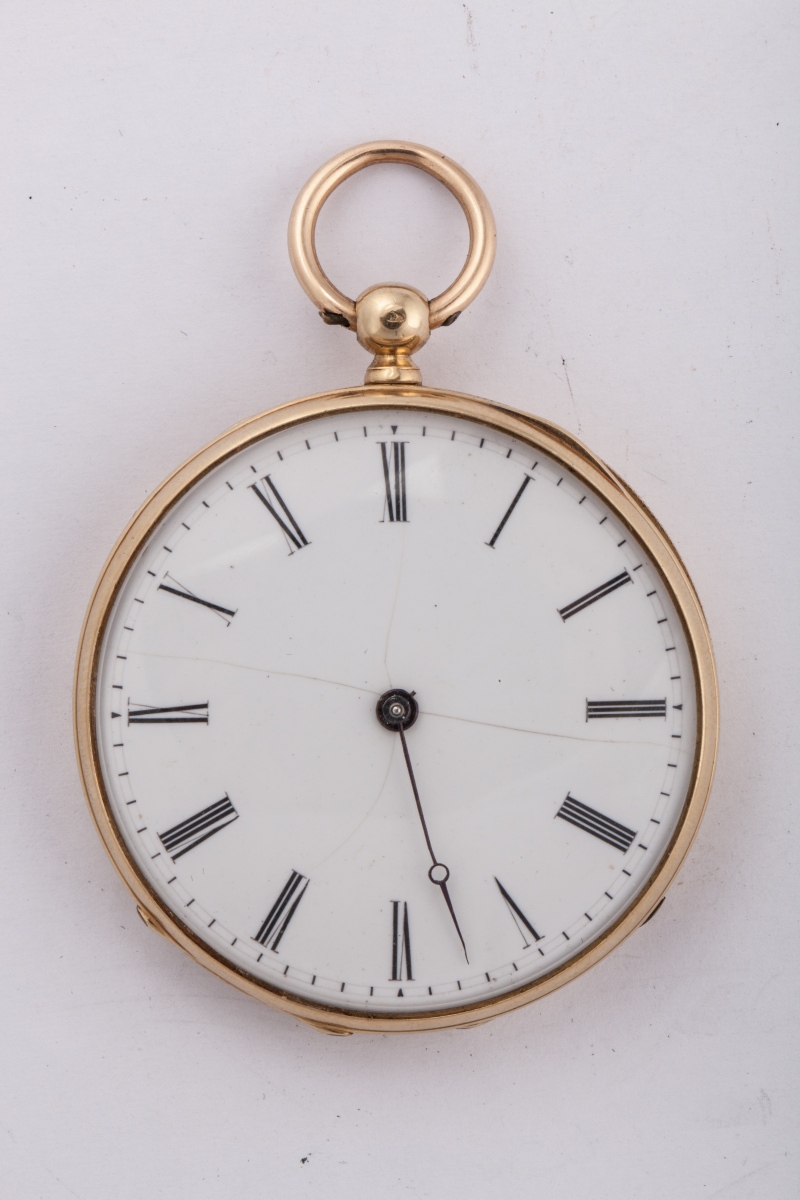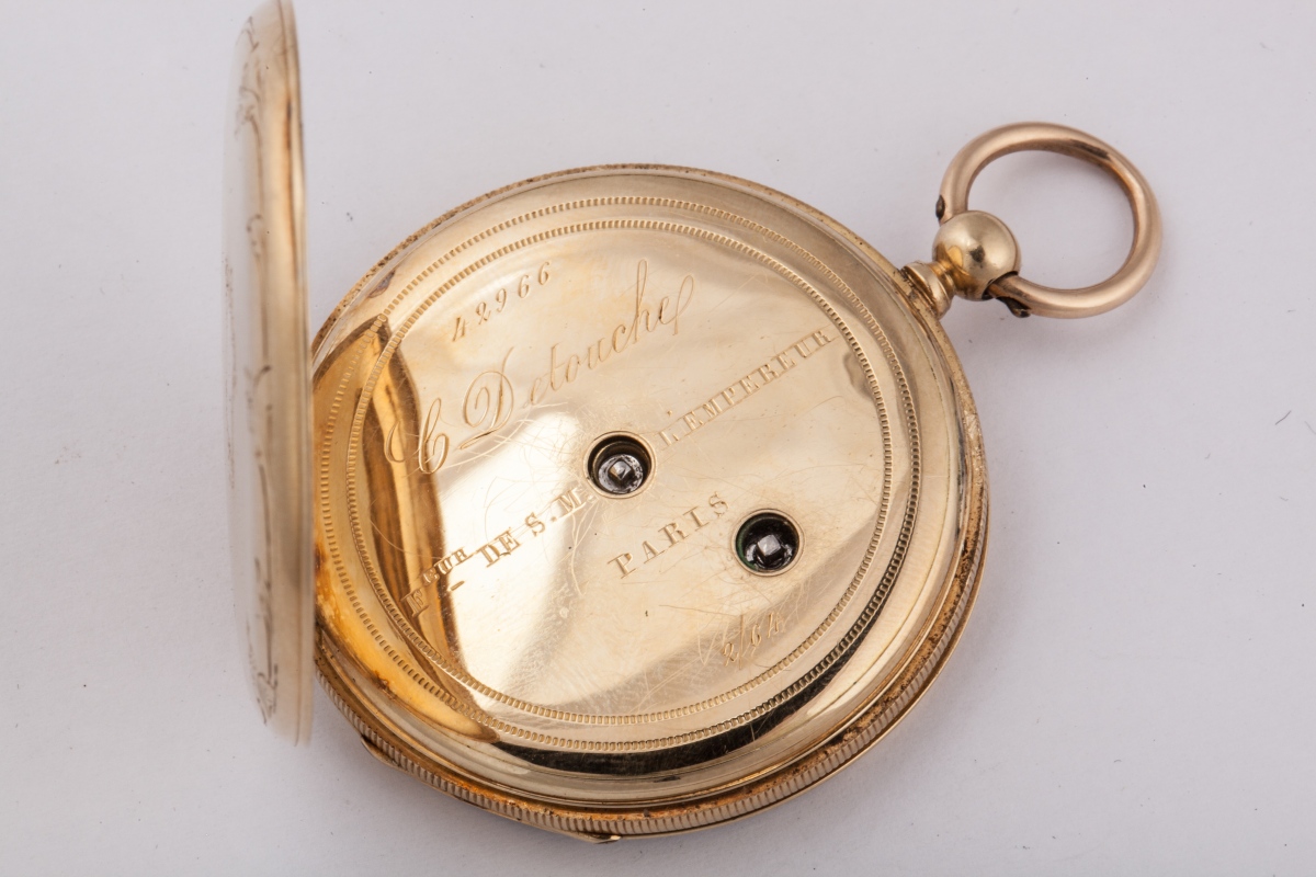 MONTRE de GOUSSET en or, à clef. Le cadran émaillé blanc, indique les heures en chiffres romains. Le boîtier est centré d'un écu agrémenté de fleur de lys, palmettes, et volutes. Le pourtour est orné d'une frise feuillagée et pontuée de fleurs, sur fond guilloché. Signée "C. DETOUCHE. Feur DE S.M. L'EMPEREUR"" et numérotée "264" et "42966".