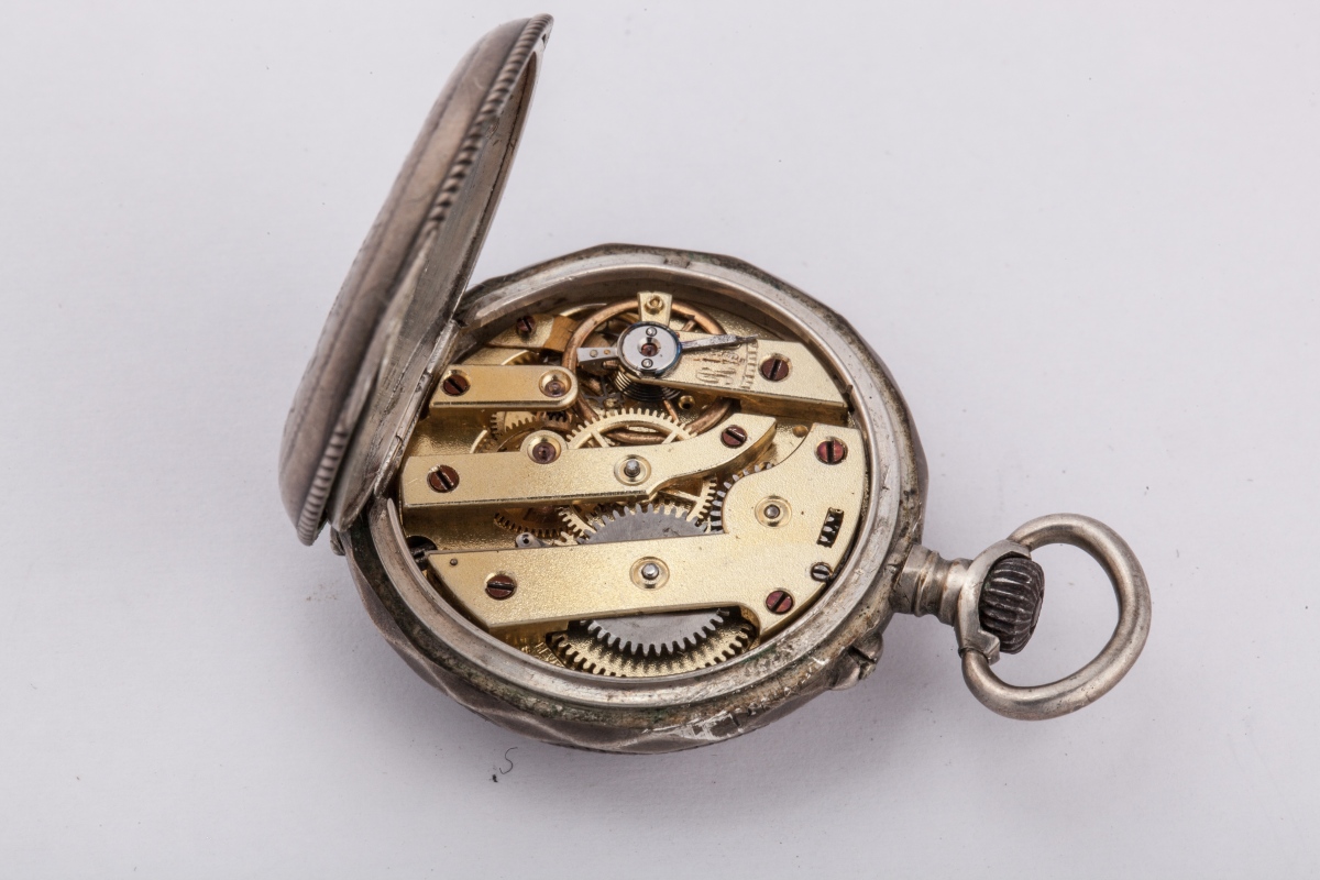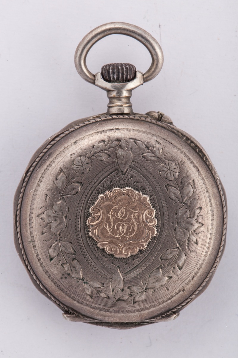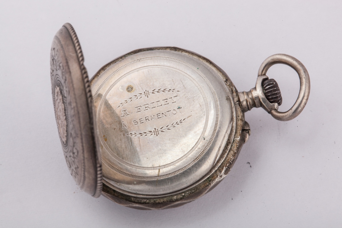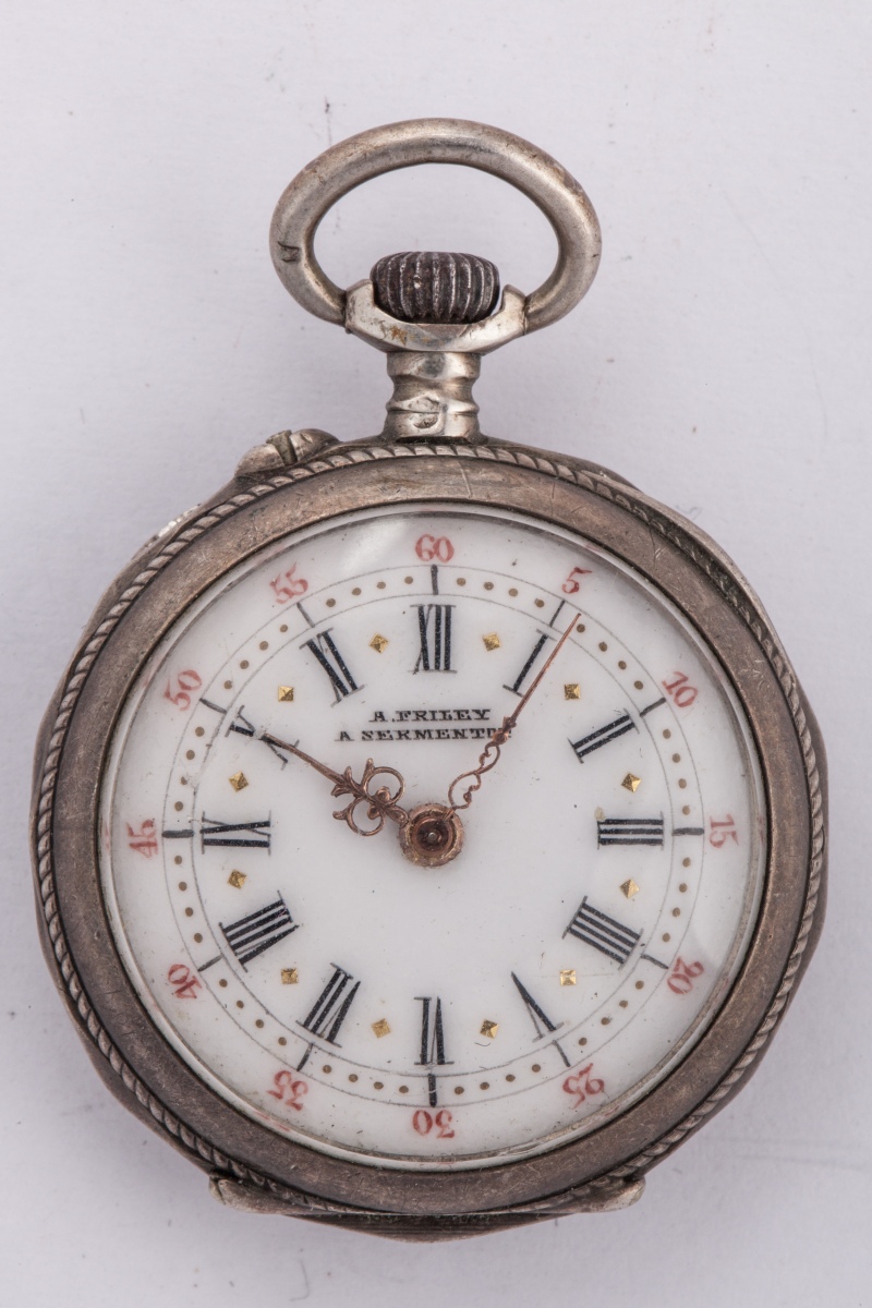 MONTRE DE COL à remontoir au pendant en argent. Le cadran émaillé blanc indiquant les heures en chiffres romains et les minutes en chiffres arabes. Signé "A. Friley à Sermentot". Le dos du boîtier ciselé de guirlandes deuillagées et centré d'un cartouche or monogrammé "L.F".