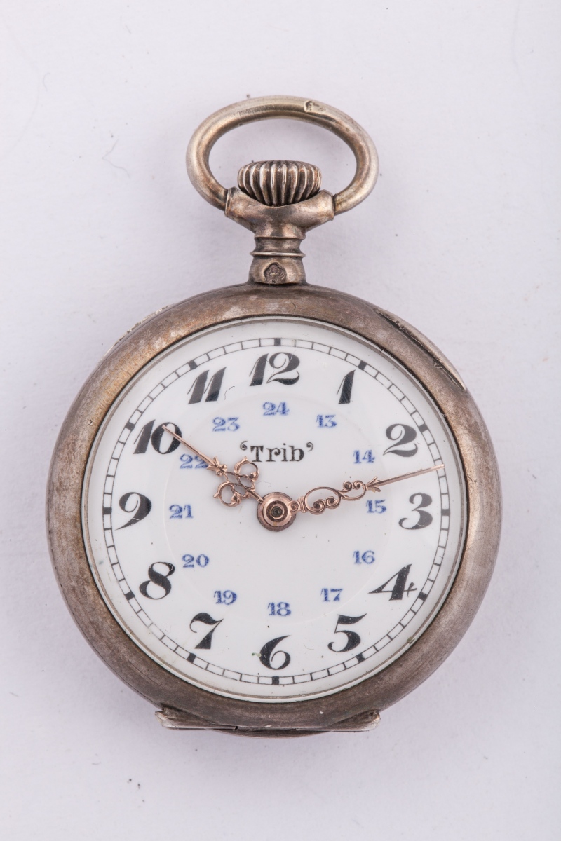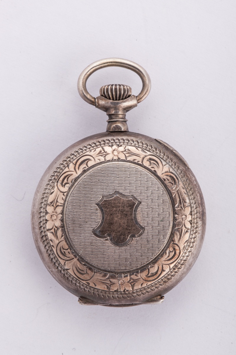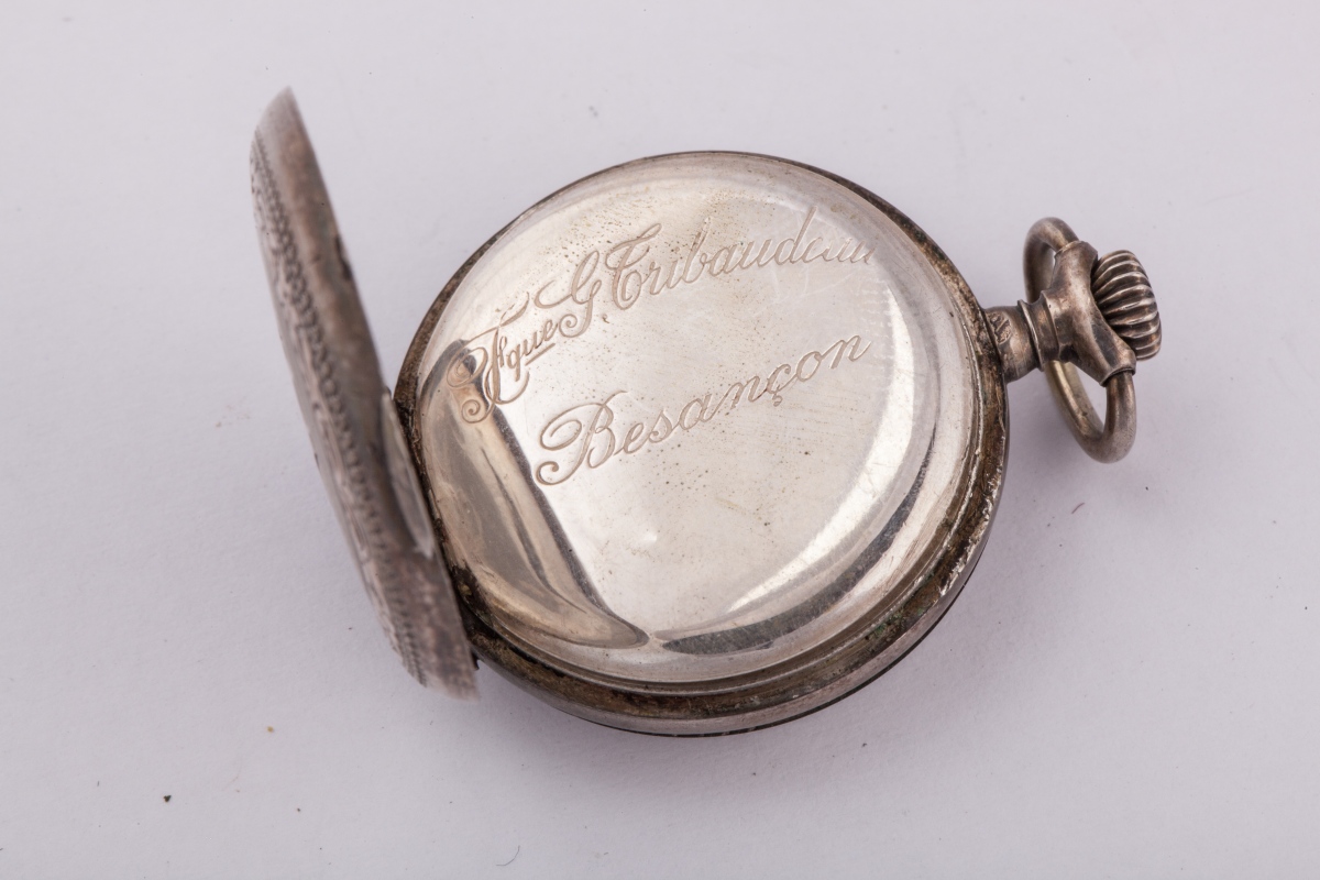 MONTRE de COL en argent à remontoir au pendant. Cadran émaillé sur fond blanc, les heures sont indiquées en chiffres arabes noirs pour les heures du matin, et bleus pour celles de l'après-midi. Boîtier sur fond guilloché à décor d'écusson doré, cerclé d'une frise de fleurs et volutes. Signée "Fque. G. TRIBAUDEAU. BESANÇON" et numérotée "22263"