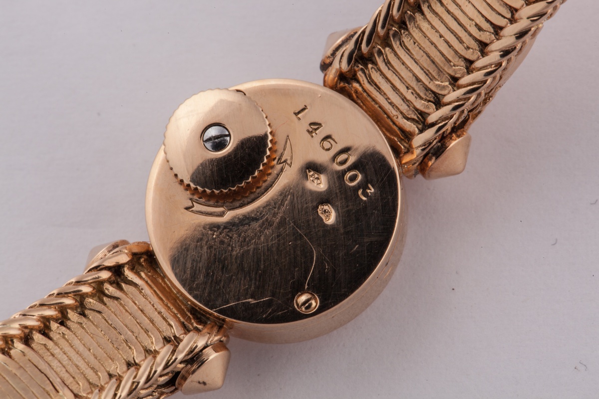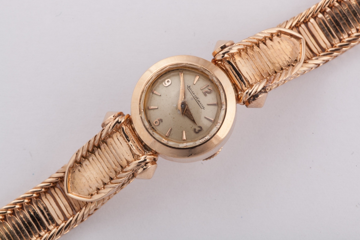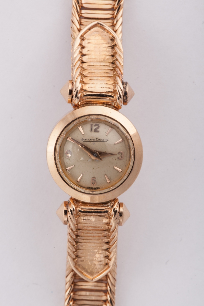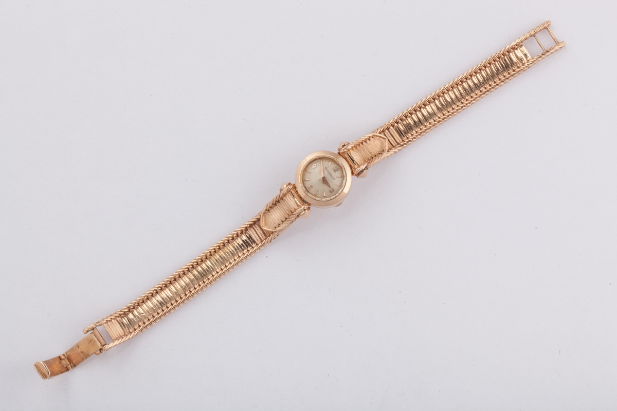 MONTRE-BRACELET de dame en or; Mouvement rond signé "JAEGER LE COULTRE n°140003". Bracelet ruban torsadé, avec écusson.