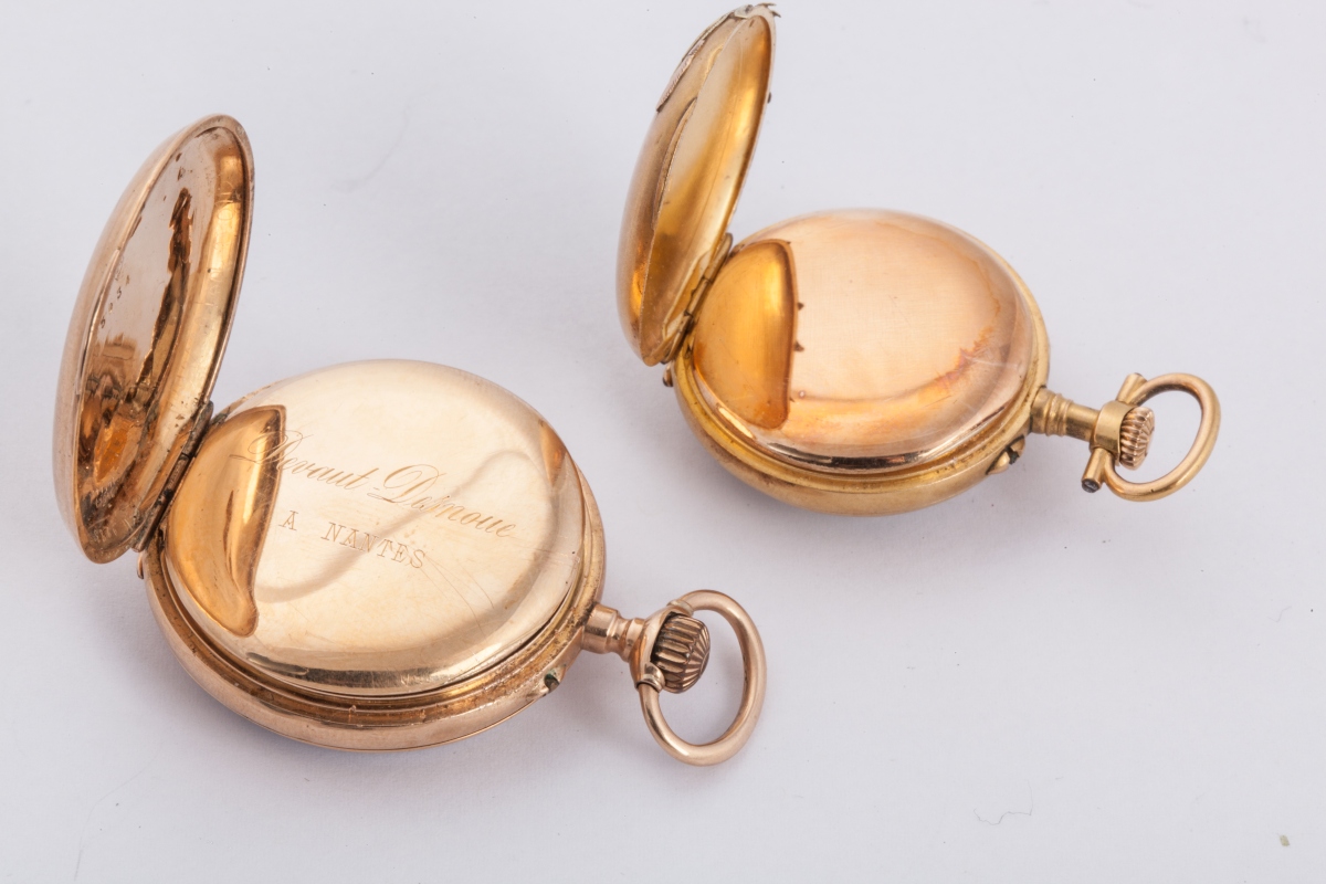 MONTRE DE COL en or jaune, le cadran émaillé, les heures en chiffres romains et les périodes de cinq minutes en chiffres arabes gradué, pour les minutes. Le boitier monogrammé BL.